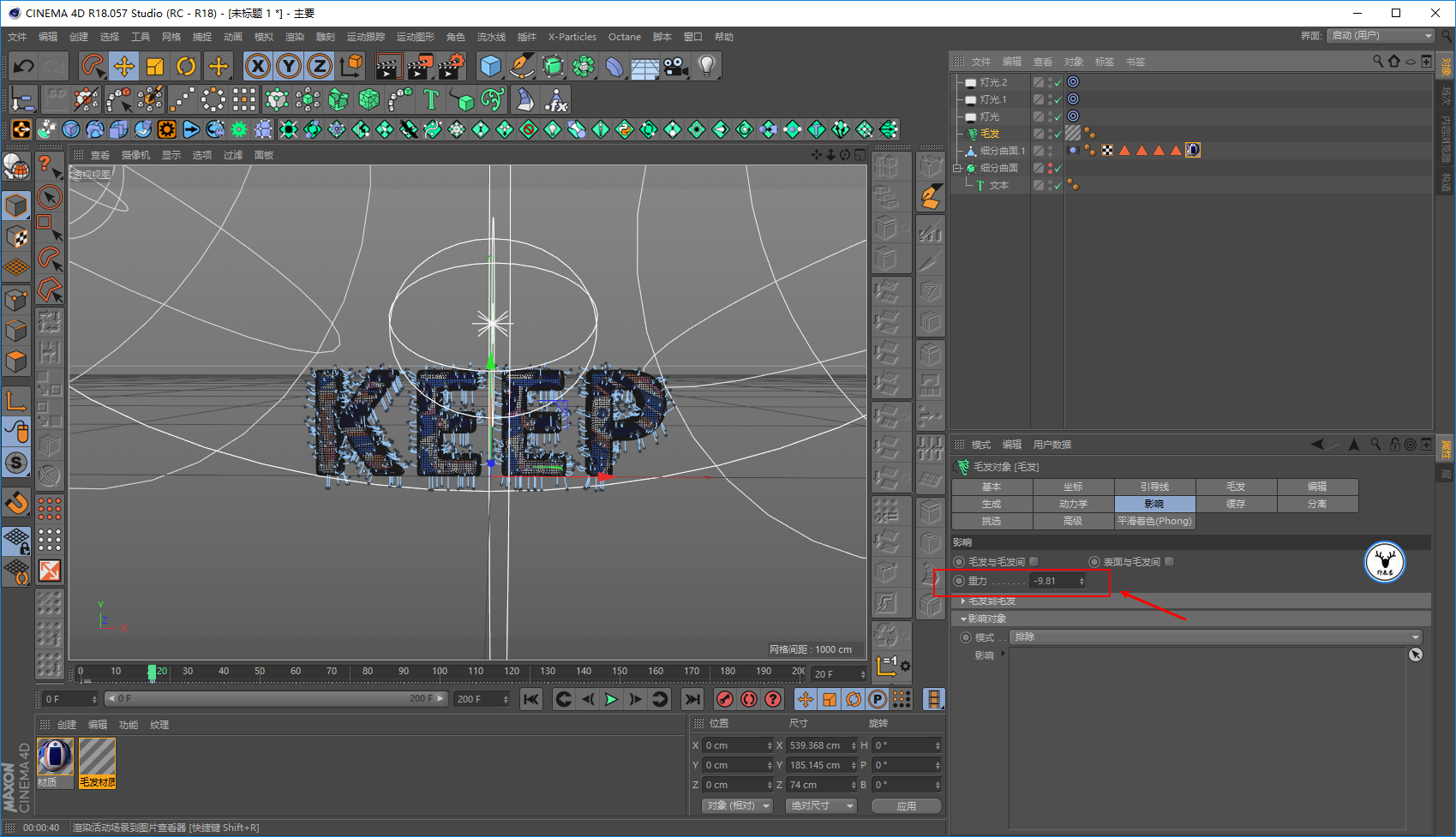 接下来可以做毛发的动画了,首先大家要记住一点,毛发对象的影响面板有一个重力数值默认是-9.81。