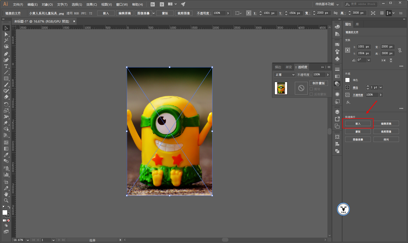 把图片拖进Ai,点击嵌入: