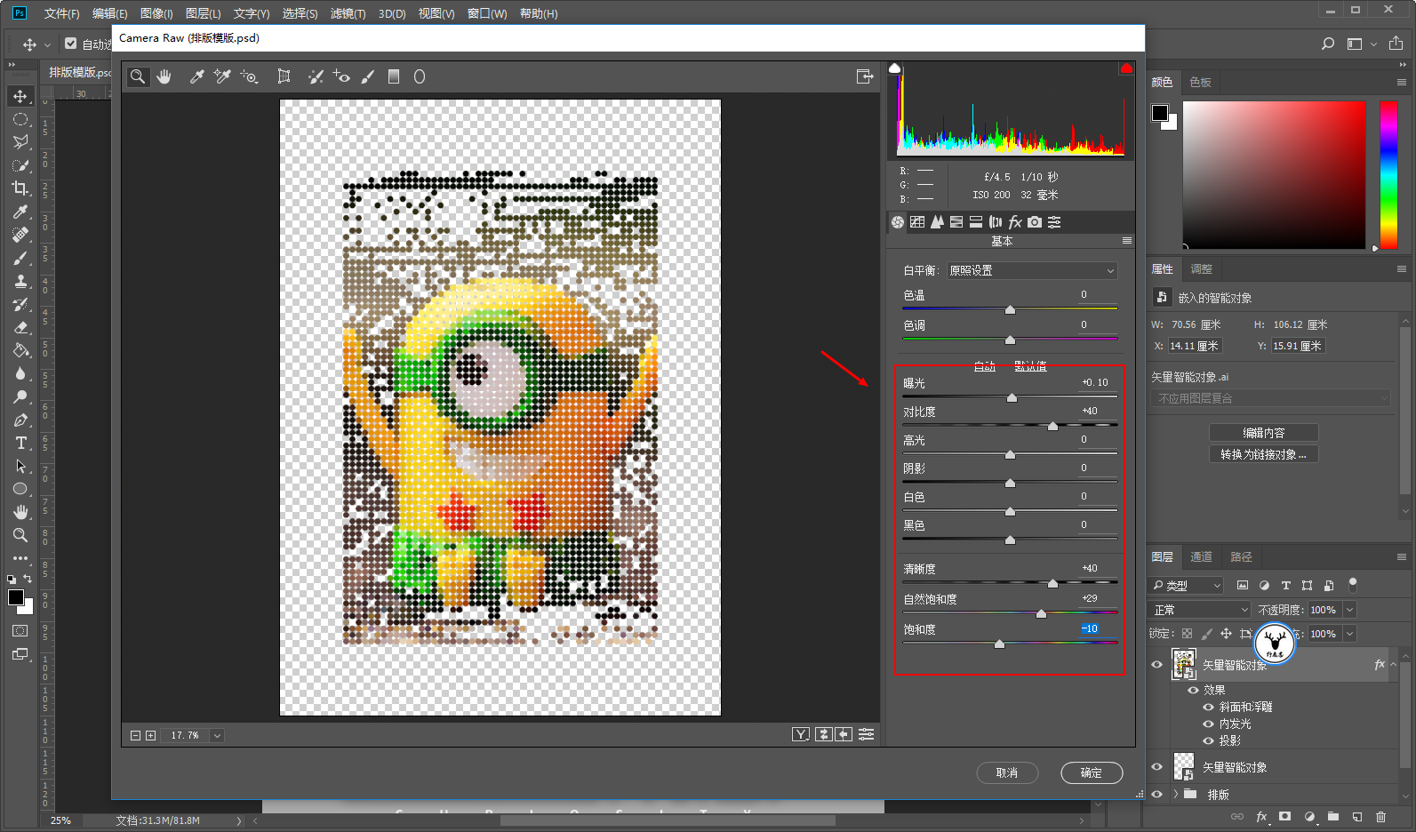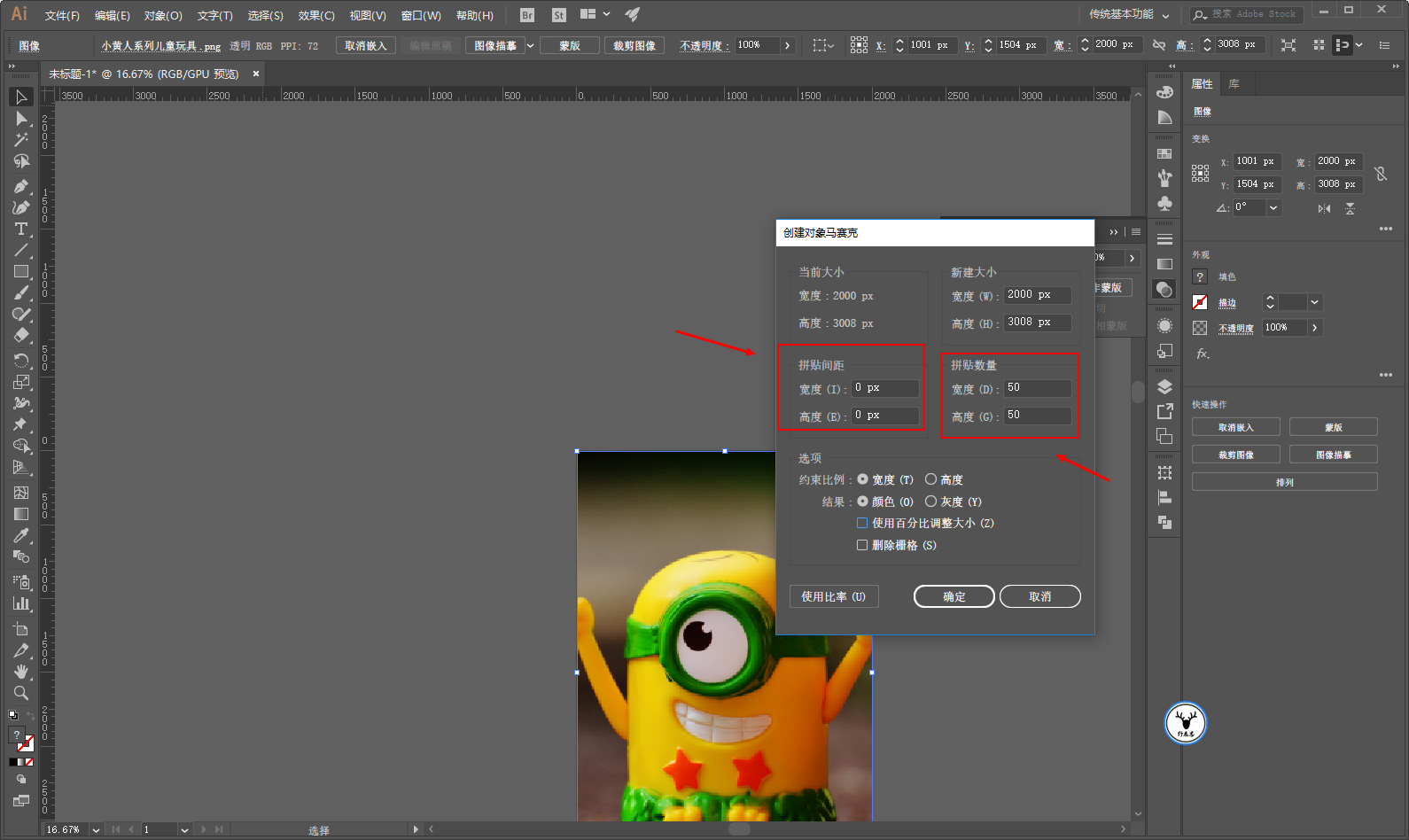 但是需要注意的是,由于我们的图片素材尺寸的原因,这里如果横纵数量都设置为50,那么必然创建出来的马赛克不是正方形。