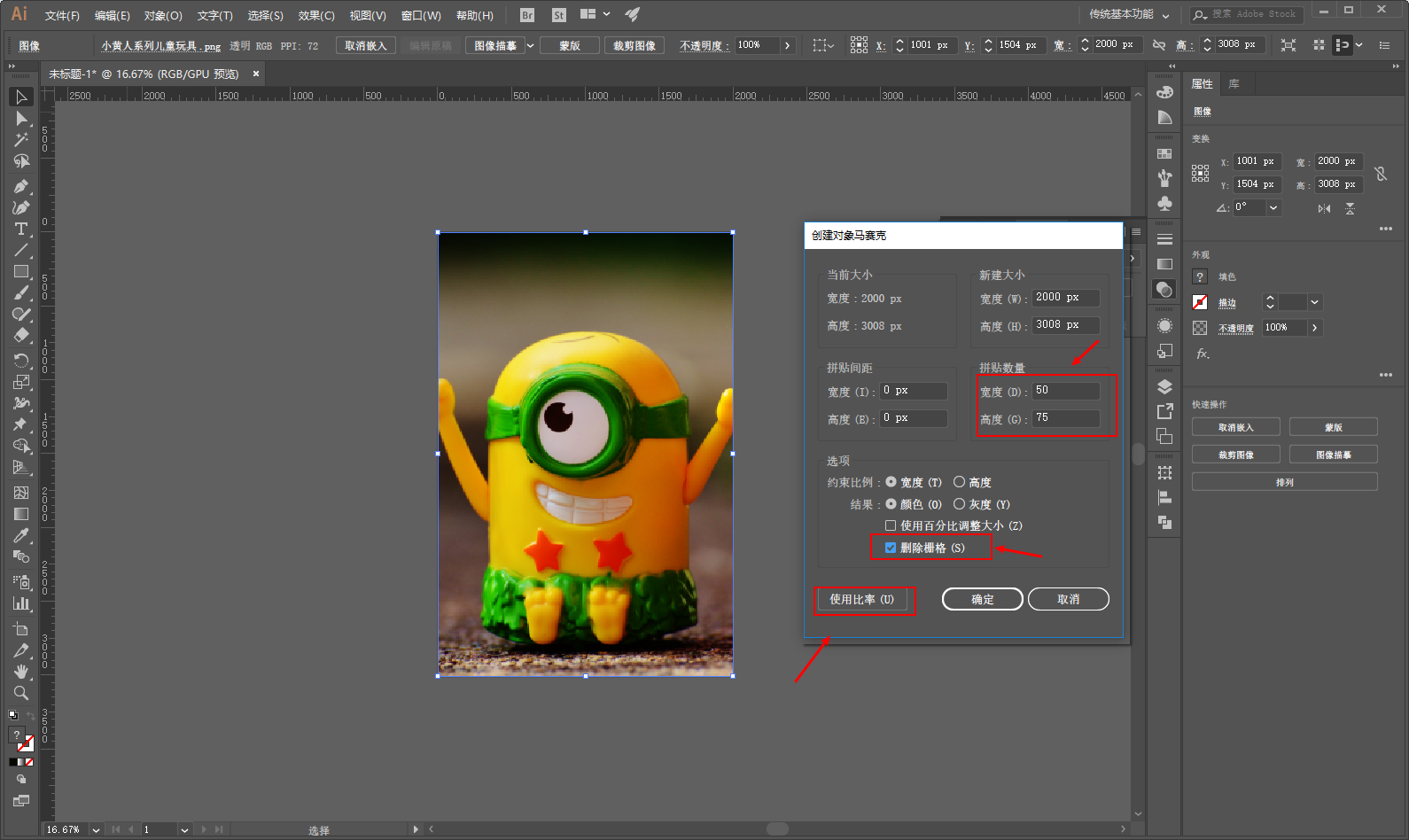 没有关系,我们只需要点击一下使用比率,那么马赛克的数量就会进行自动适配,记得勾选删除栅格: