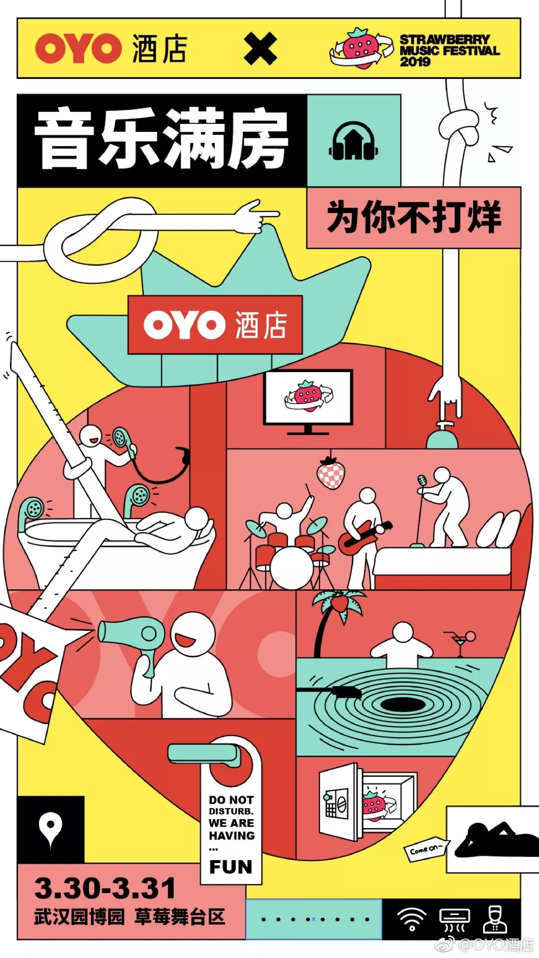 而武汉OYO酒店与摩登天空联合主办的活动中,一张以“音乐满房”为主题的插画也分外有趣——原来大家为了迎接音乐节,都关上门在房间里引吭高歌呀...