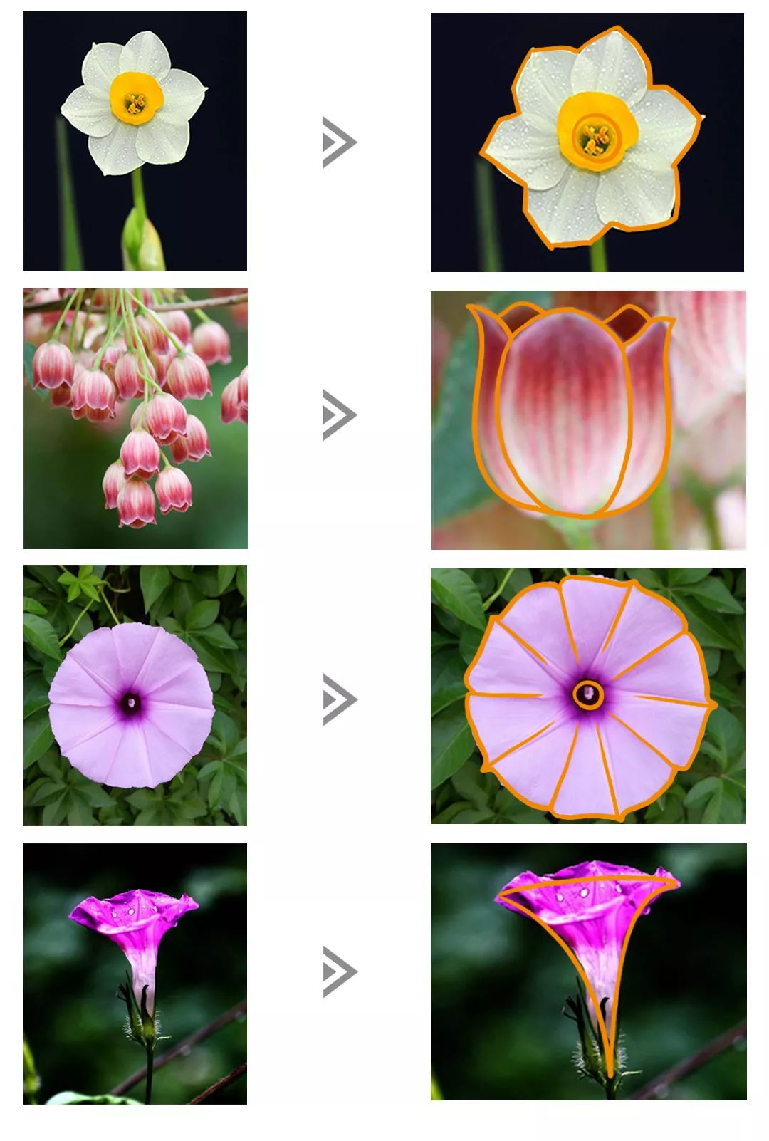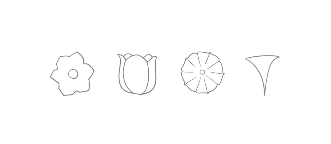 从网上搜索出我们需要绘制物体的照片。接着进行造型概括,对外轮廓进行大致描边。当遇到有细小变化的时候不要被细节变化带跑(如下图所示第四个喇叭花上方的造型有很多小波浪褶皱,我的处理是直接拉直线概括)观察物体的正确方式应该从物体外轮廓进行观察概括,通常会用到将物体比作几何形或拉直线的概括方法。