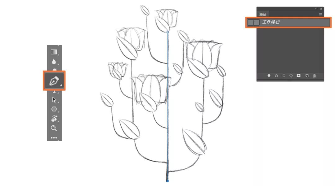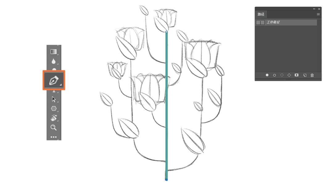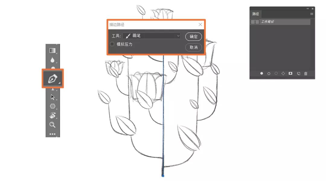 在纸上绘制一个简易版花杆,将大大小小的花朵和叶子串起来。接着用钢笔工具(P)将其中一个花杆勾出来,找到路径工具,右键选择描边路径(描边路径中的工具选择画笔,画笔是系统自带的硬边圆画笔,根据自己的需要调好画笔粗细和颜色)。