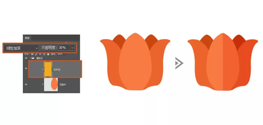 新建图层并创建剪贴蒙版,右半边部分填充为黄色,模式选为【线性加深,不透明度调为30%】。右半部分的颜色变深,呈现对折的视觉效果,同时也帮助下一步亮暗面的塑造。