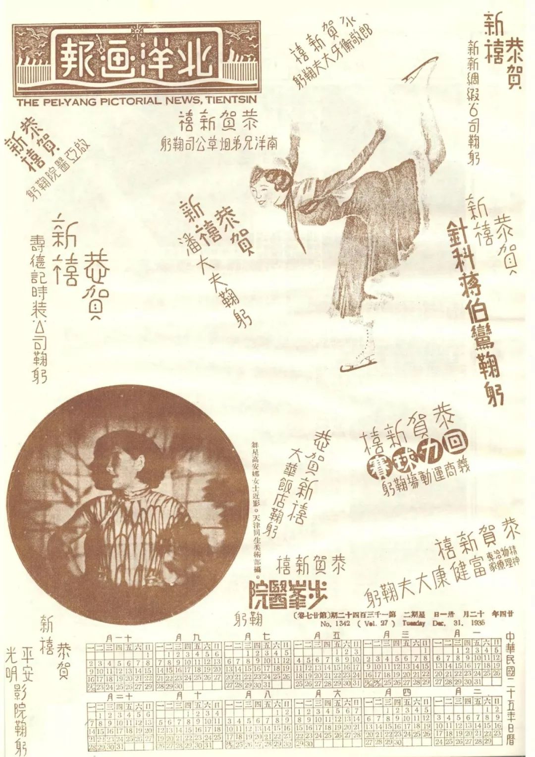 而更有意思的是,品牌主们似乎看到了广告的魅力,从此之后元旦的前后,成了品牌主们的“超级品牌日”,它们会集中的投放广告,下面是某一年各大品牌集体在《北洋画报》上拼版贺元旦。