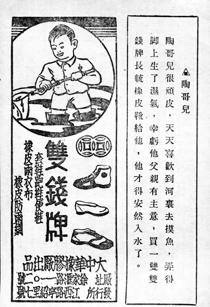 陶哥儿很顽皮,天天喜欢到河里去摸鱼,弄得脚上生了湿气,幸亏他父亲有主意,买一双双钱牌长筒橡皮靴给他,他才得安然入水了。