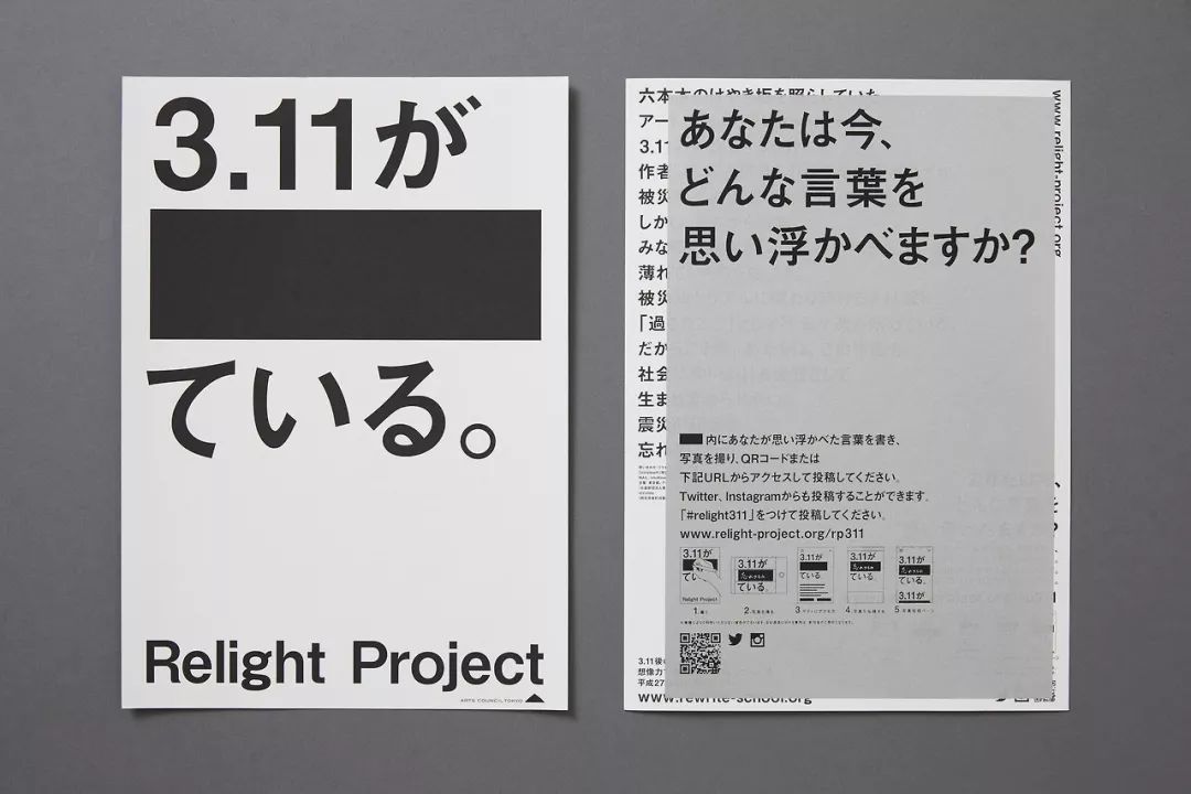 还有「Relight Project」(重燃计划)也是这个类型的创作活动。从2011 年3 月11 日发生东日本大地震至今,长年累月发生了不少的变化,「Relight Project」这个创作活动就是将这样一个多样的3・11 东日本大地震以视觉化的方式呈现给大家。关于3・11 东日本大地震,人们的记忆会逐渐淡化,价值观也会改变,有的人抱着乐观的想法,有的人则有着不同的意见。因此,我想通过这个作品提醒大家无论是选择复兴还是选择忘却都要抱有怀疑,不要持一边倒的态度。与此同时,我也想通过这个作品来唤醒人们对3・11 东日本大地震的关注。