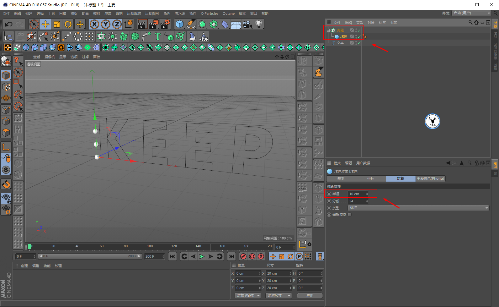 新建克隆对象,新建一个球体适当的缩小球体的尺寸,让克隆对象克隆球体:
