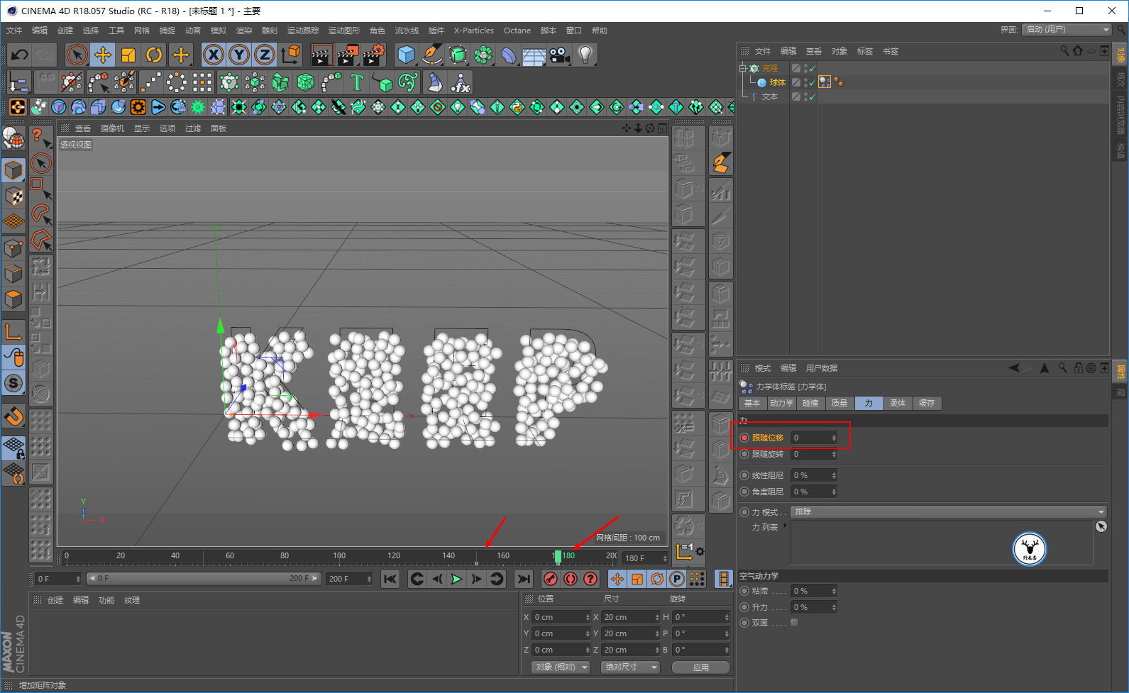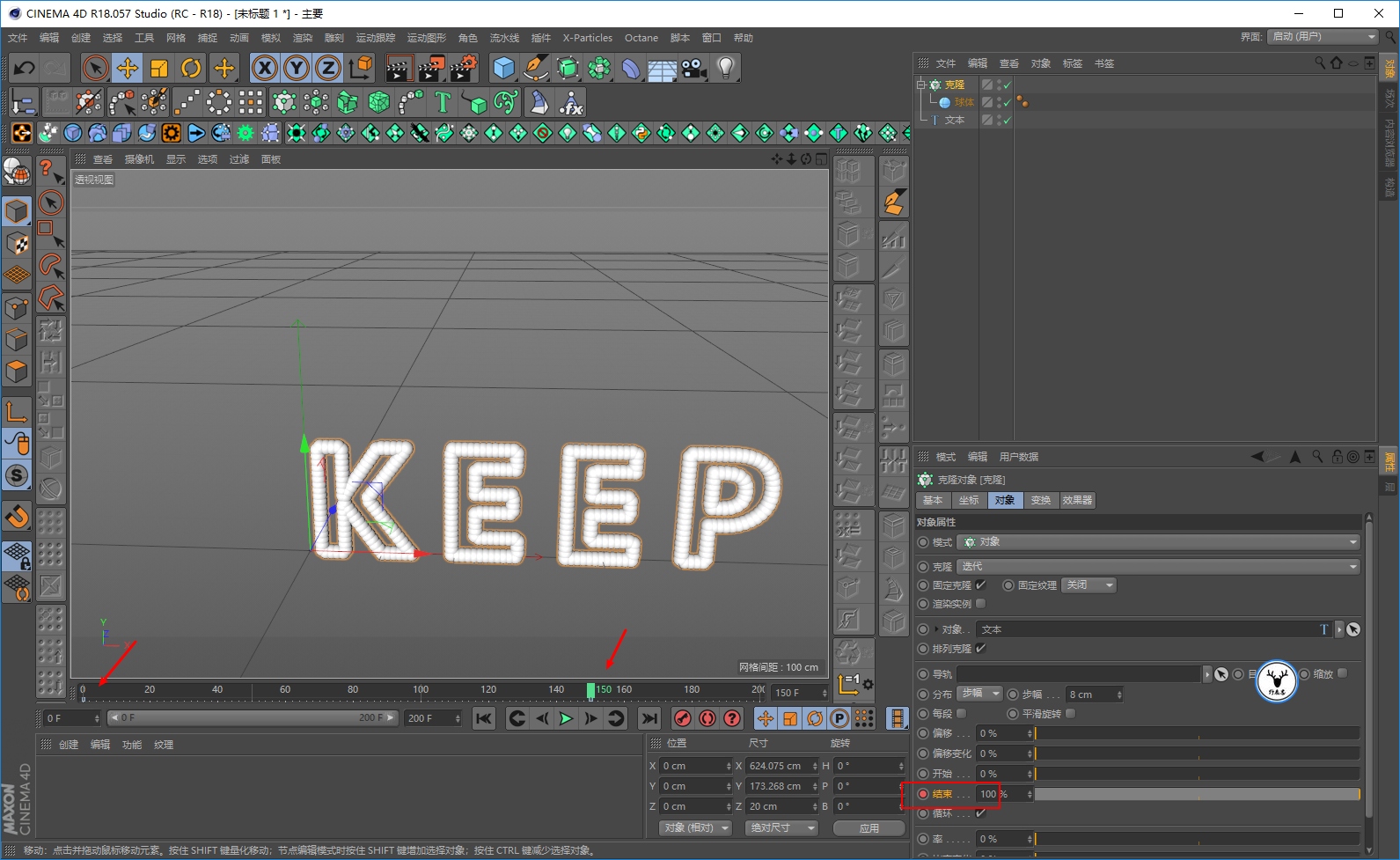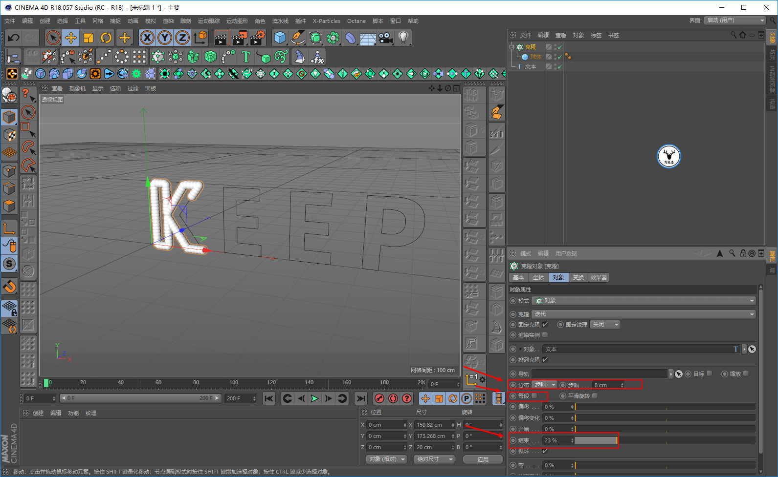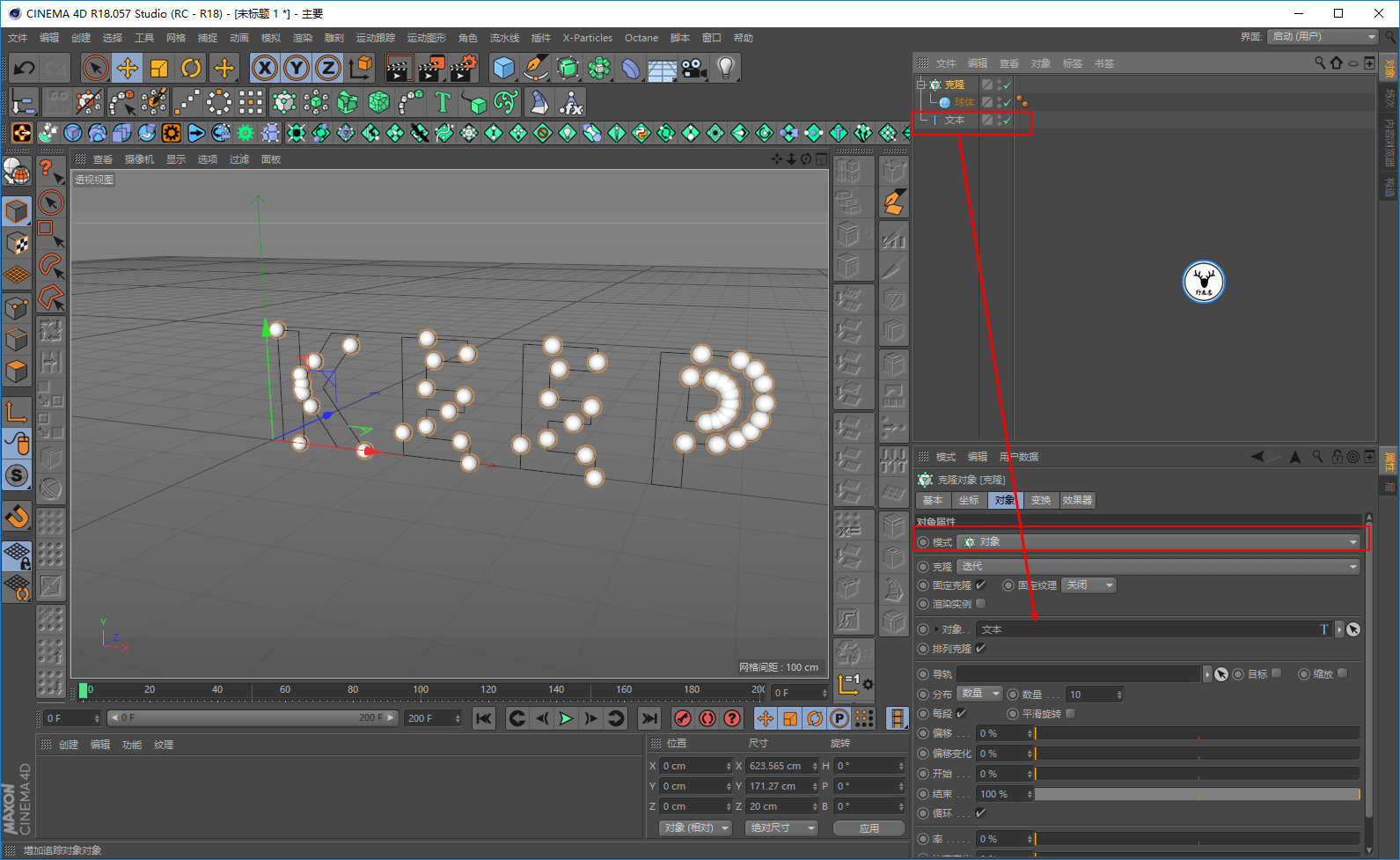 将克隆模式改为对象,以为文本样条作为对象来进行克隆: