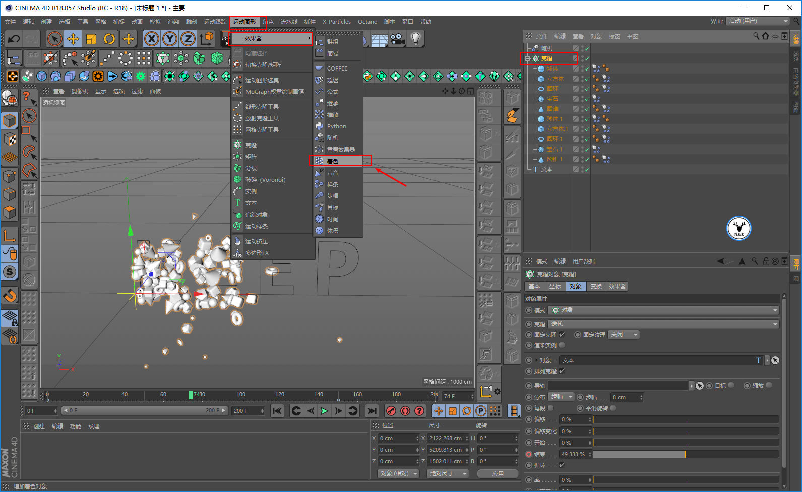 其实要实现这个效果也不难的,首先我们需要在选中克隆对象的前提下添加着色效果器: