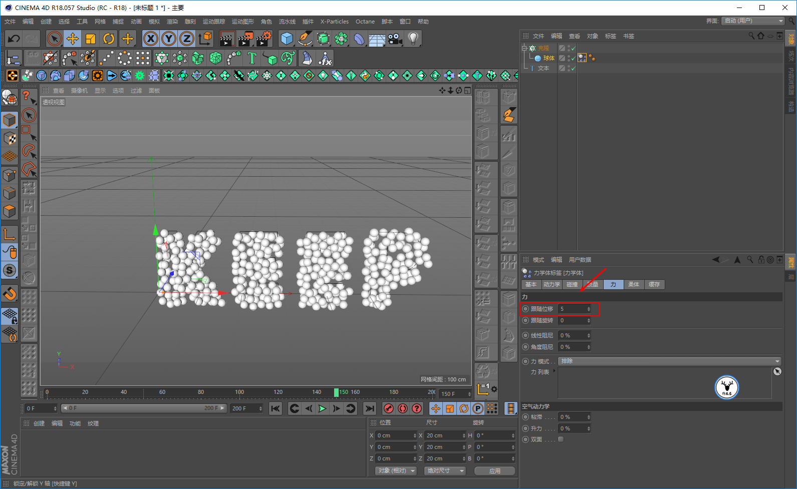 我这里希望的是当生长动画完毕时,小球会下落,所以在150的时候跟随位移的数值都是5打上关键帧,然后在180帧的时候,跟随位移的数值为0打上关键帧: