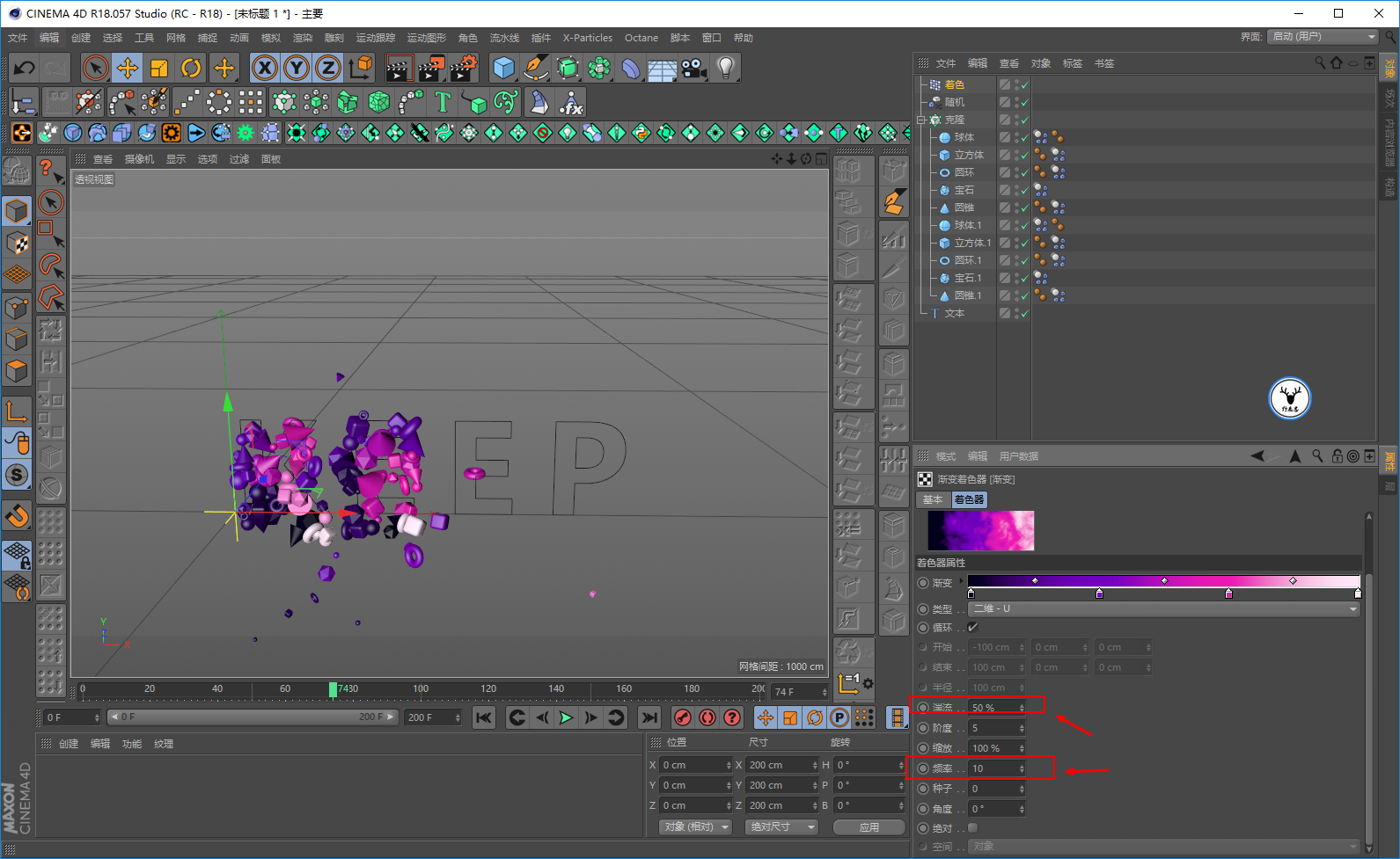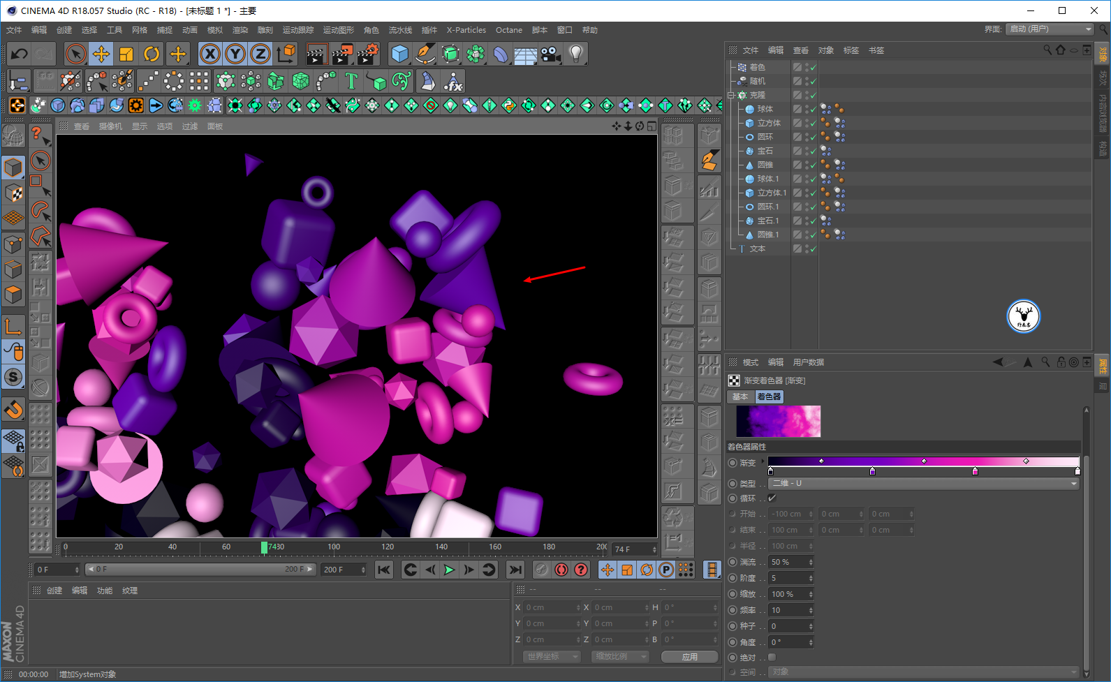 所以这里我们需要新建一个材质球,把它丢给克隆对象,你会发现材质球的颜色会覆盖掉着色效果器的颜色。然后在颜色通道添加一个颜色着色器: