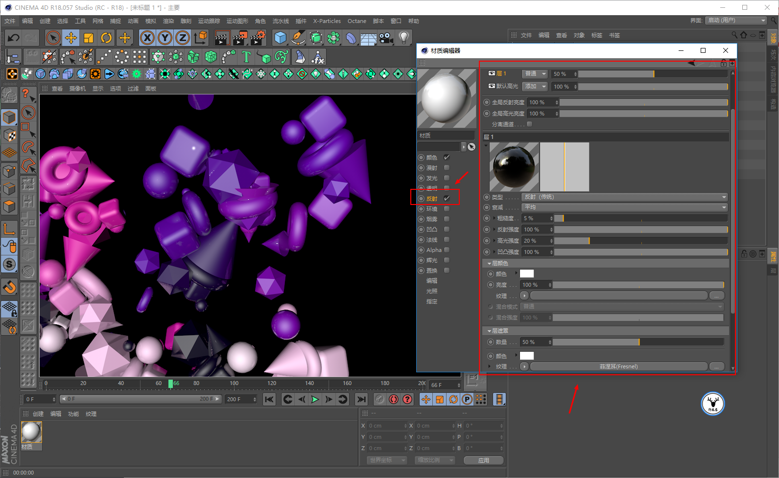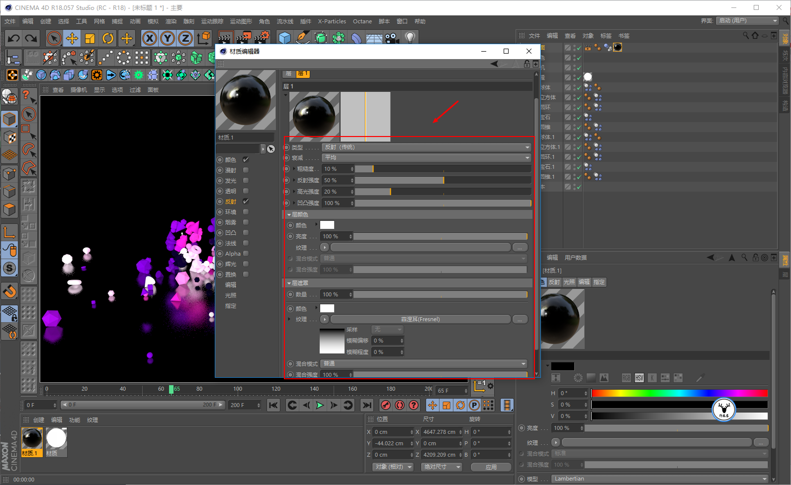 给平面添加一个黑色的反射材质,同样参数看着效果来就好: