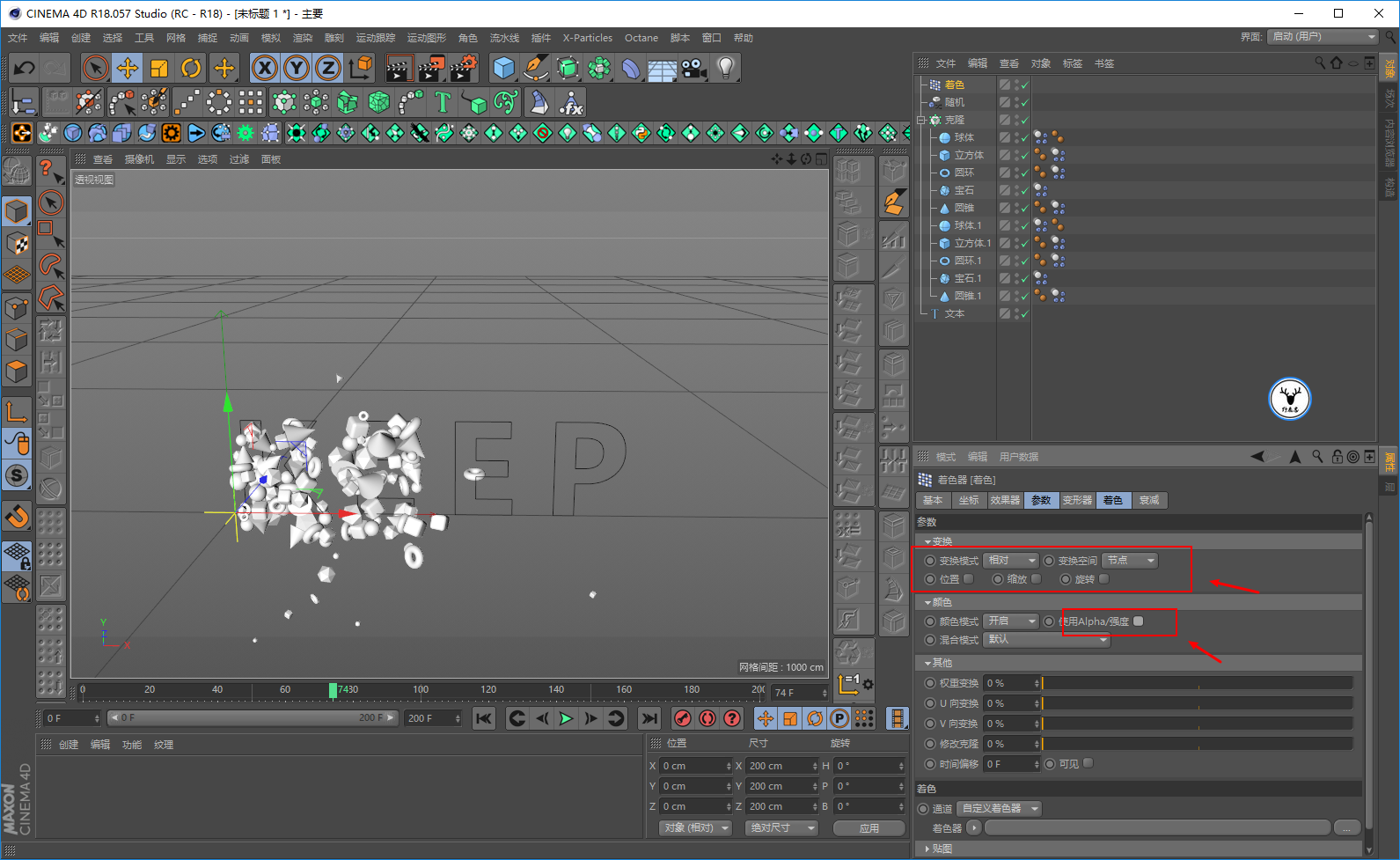 这里我们让着色效果器只影响对象的颜色,不影响位置、缩放以及旋转,记得把使用Alpha强度的勾去掉: