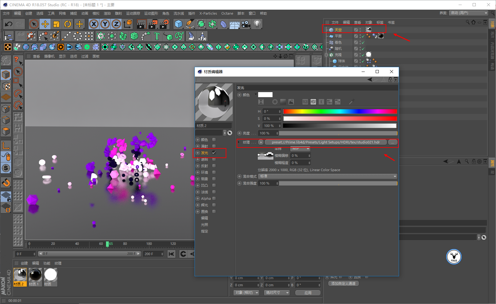 新建一个天空和材质球,材质球只勾选发光通道,贴一张HDR贴图上去,把材质球赋予天空让它作为环境光: