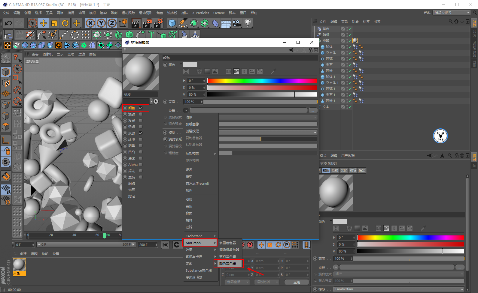 这个时候对象就既会使用着色效果器的颜色,并且也可以通过材质球来调整它的反射等信息。