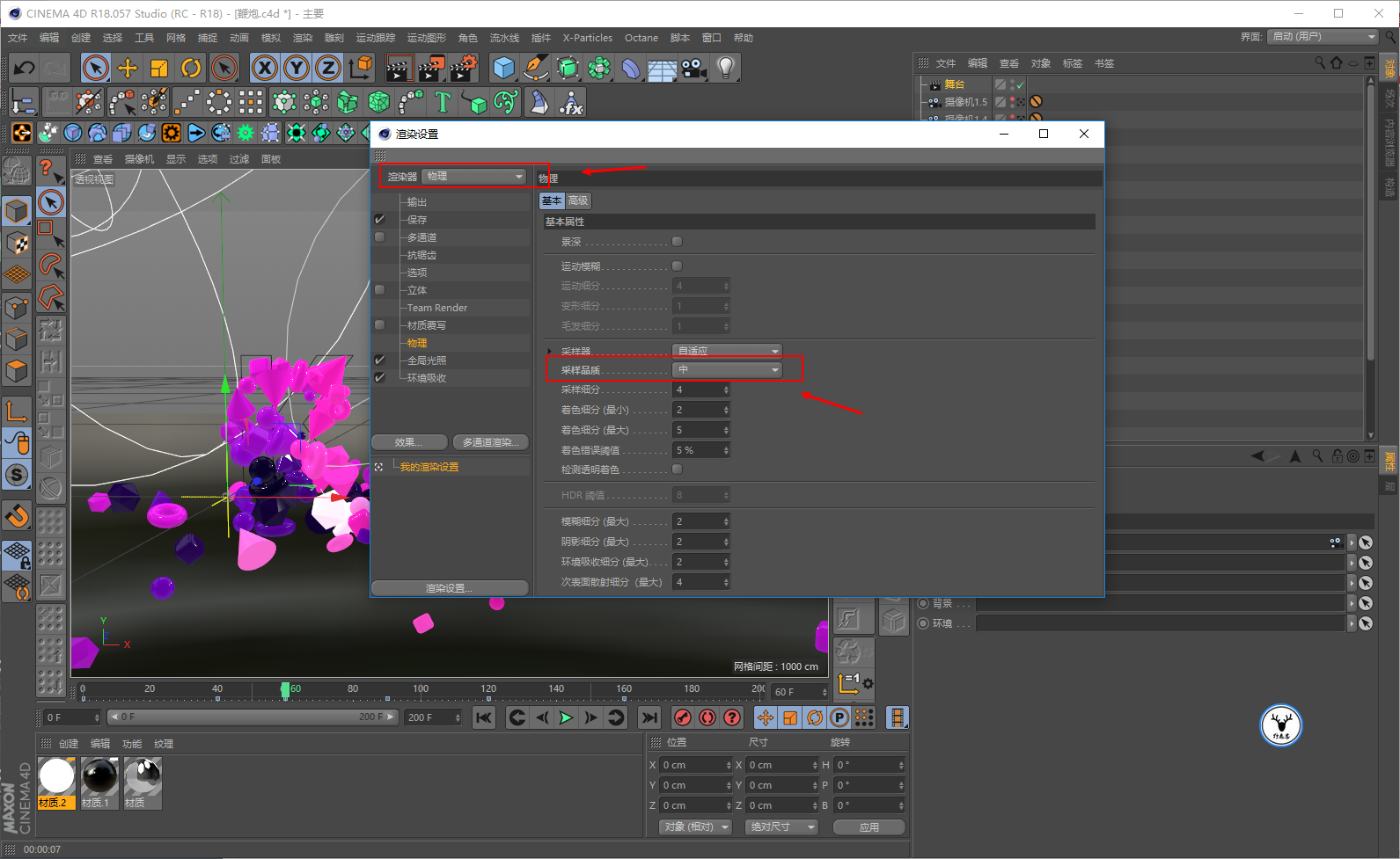 渲染器选择物理渲染器,采用品质中等,这样的话噪点会比较少一点,不过也会增加渲染时长: