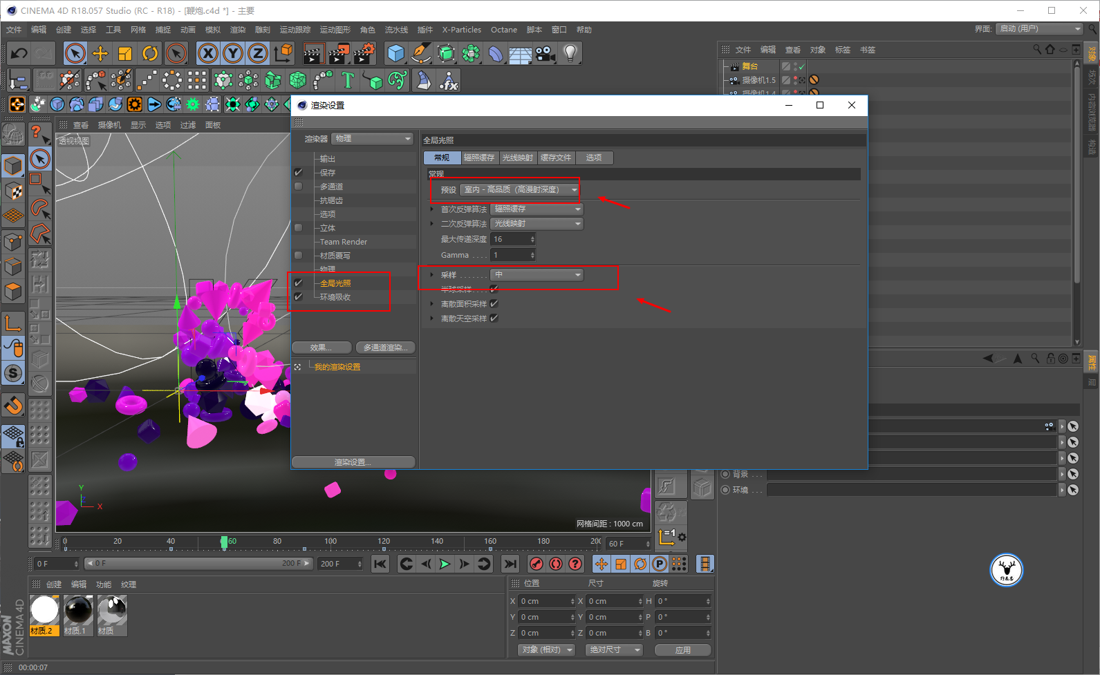 渲染设置里我开启了全局光照和环境吸收,全局光照的品质可以选择高一点:
