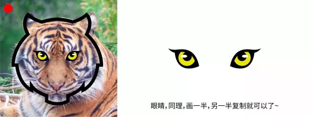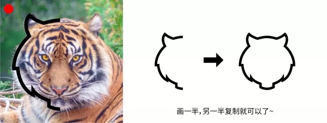 ▲2、用钢笔工具把老虎的头型勾出来,有一个技巧就是,只要勾一半就可以,另外一半直接复制。