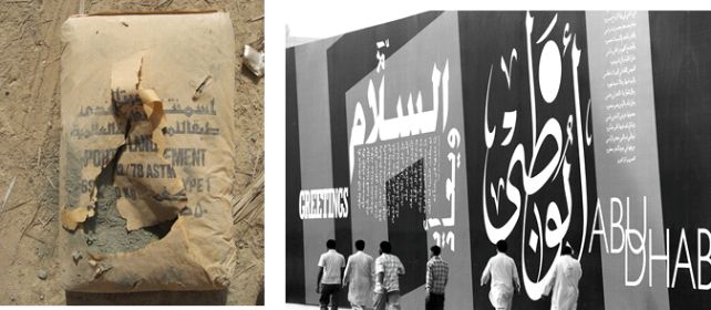 对我来说,很多偶然被发现的东西都根植于语言,标题所说的发现文字,也就是发现图像中的文字。我在阿布扎比沙漠发现了一个废弃的水泥袋,上面印有阿拉伯语和英语,并且已被撕裂,因此英语被推到了阿拉伯文字中。这个小时刻成为我在阿布扎比文化区工作的视觉项目的灵感来源。它变成了一个10米高的墙,长达2英里——阿拉伯语和英语排版相互作用。