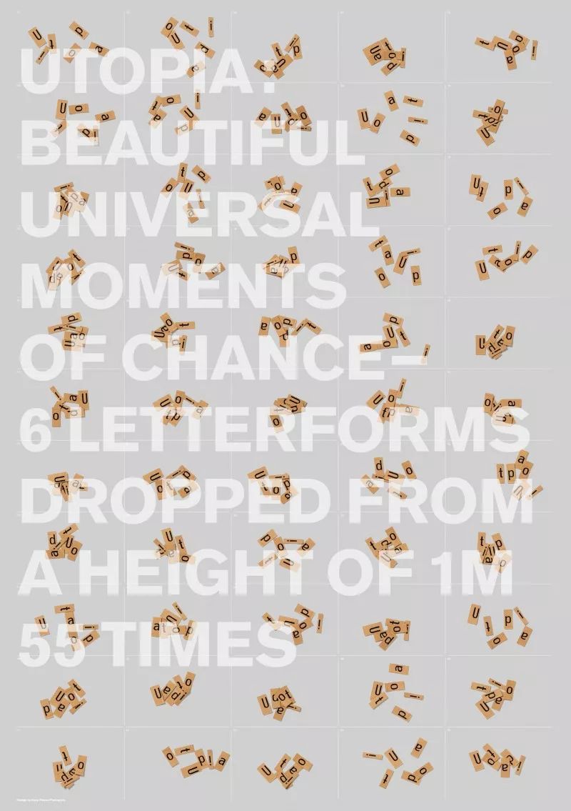 这是我被要求为一个庆典设计的视觉,表达未来乌托邦存在所必需的东西。我的想法是,机会和意外在社会发展过程中一定是不断出现的——它没有被一些先进的技术所根除。这张海报就是依托于偶然性而制作的,我们真的把乌托邦这个词放了53次。我们让这些字母随机下降并记录了下降的方式,所有这些随机的“下降”就成为了海报。