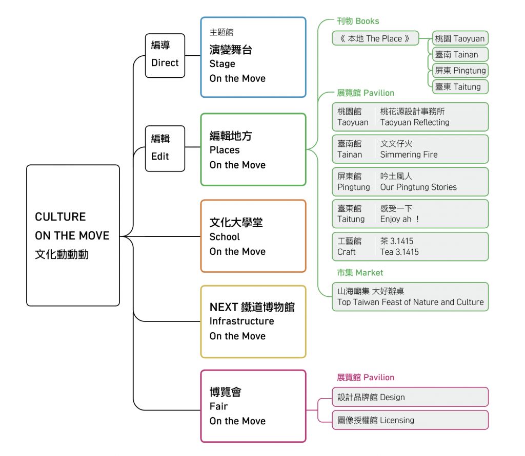 沿着台北产业廊道线,横跨华山、松菸、花博争艳馆、空总当代文化实验场、台北机厂等五个展区,分为“演变舞台” 、“编辑地方”、“博览会”、“文化大学堂” 、“NEXT铁道博物馆”五大主题,以城市为展场,在文化的动态里扰动台湾人、事、物与思维。