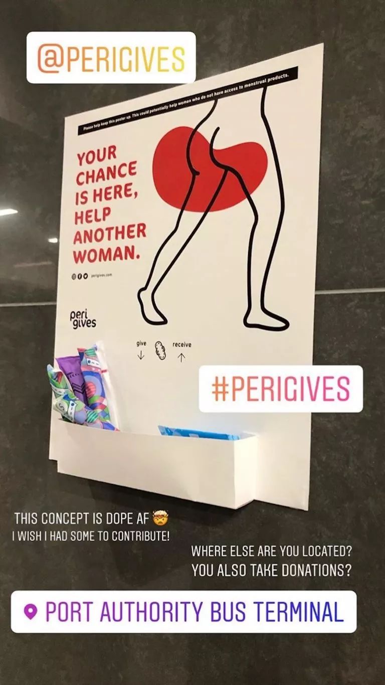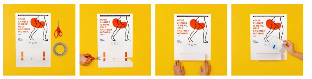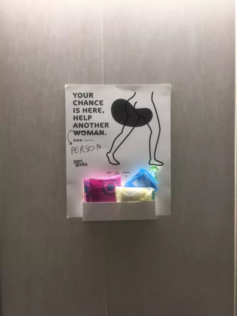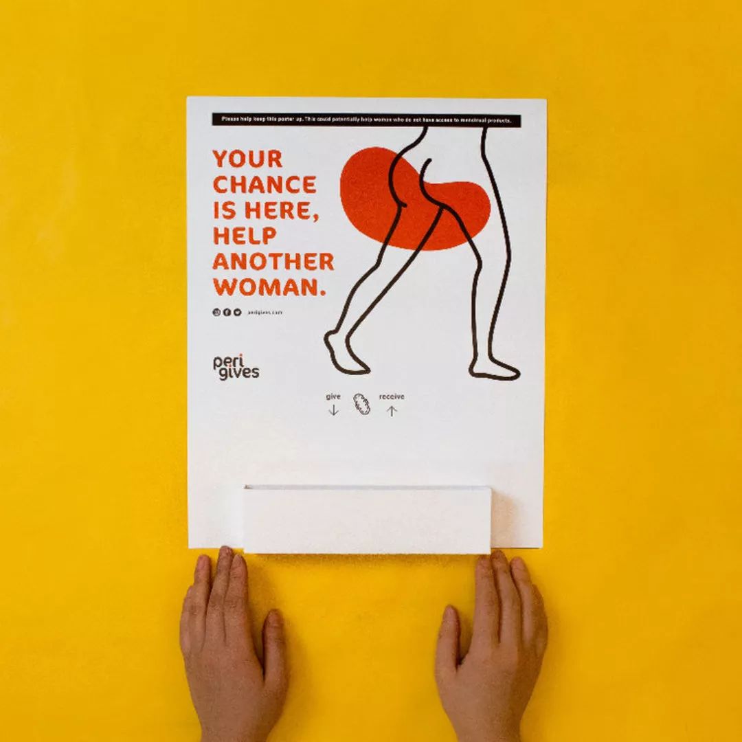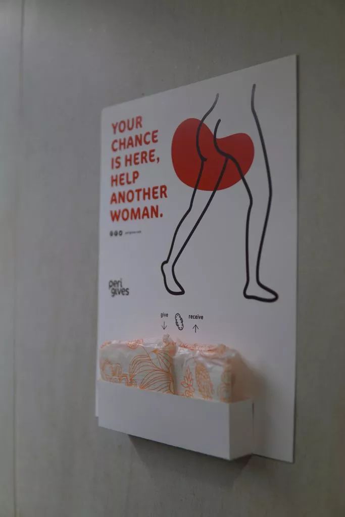 而来自纽约平面设计师艾琳了解到这种严峻的社会情况后,便与大学时代的2位朋友一起设立了“Perigives”项目,她们设计了一张带有口袋的海报,海报上写着:“你的机会就在这里,帮助另一个女人。” 借此来鼓励使用卫生间的女性将身上多余的卫生巾或卫生棉条捐赠给有需要的人。