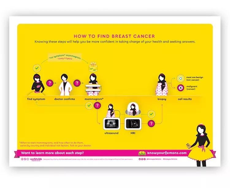 而为了避免向大众传播已经过时的信息,所以世界乳腺癌慈善组织每年都会定期修改海报的内容,下面就是最新版本的海报设计,是不是非常形象呢?