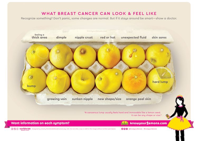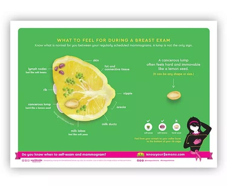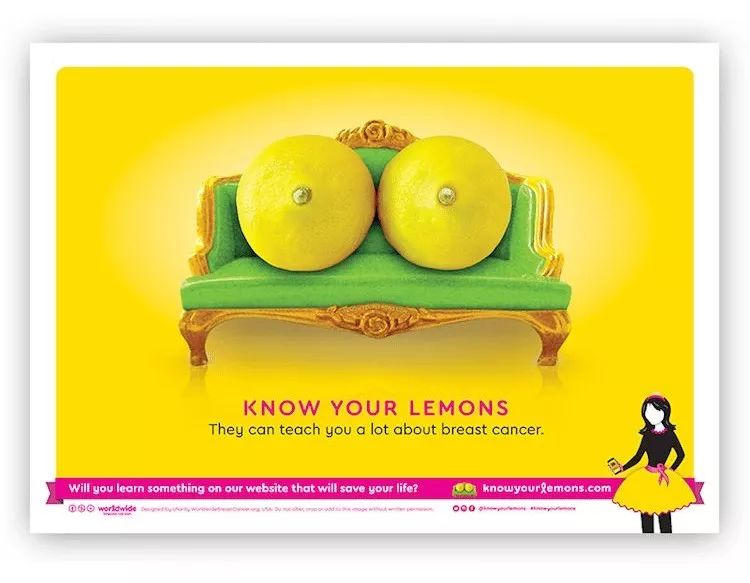 相信不少朋友都看到过这组公益海报,设计师Corrine Ellsworth Beaumont用了12种不同形状的柠檬来象征乳腺癌患者的乳房形态,除了大家经常了解的特征,如凸起和肿块,还形象的表达了尺寸,形状,颜色等方面的不太明显的变化。让每个缺乏癌症知识的女性都可以自检身体状况,曾在Facebook上引起了300万的浏览量和超4万次转发。