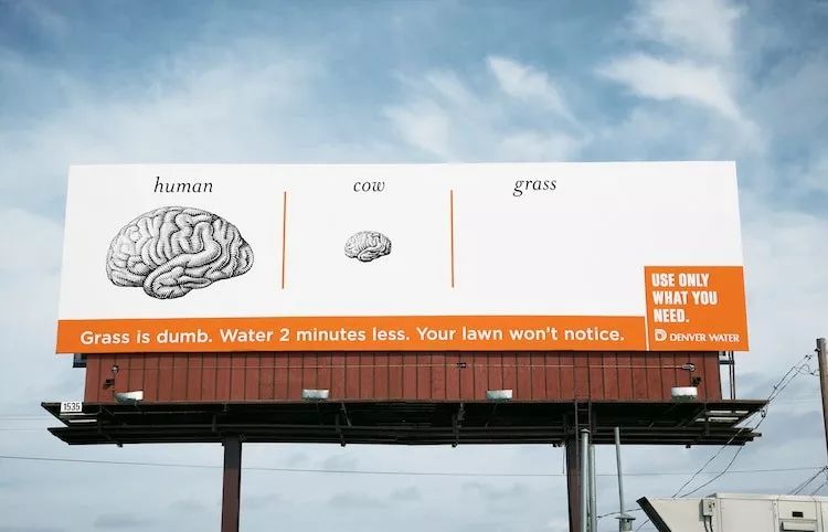 为了配合精心构思的广告语,该公司一直在提供引人注目、诙谐的视觉效果。在其中一个广告牌上,他们的设计只占据了非常小的部分。而另一个广告牌则比较了三个大脑——人、牛和草。当然,小草没有大脑,于是出现了这样的标题:“小草是傻子,所以你少浇2分钟水你的草坪不会注意到的。”