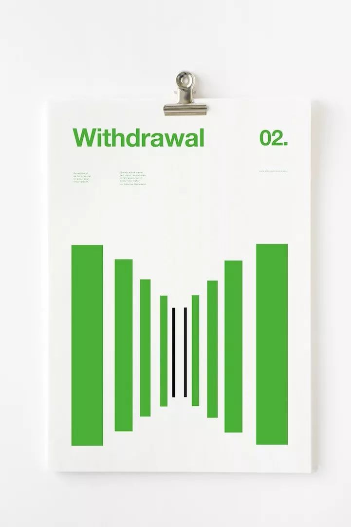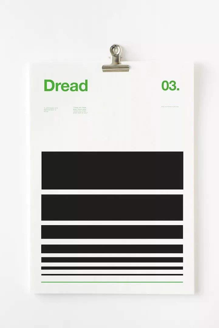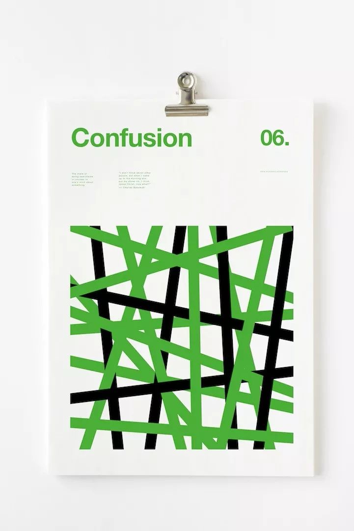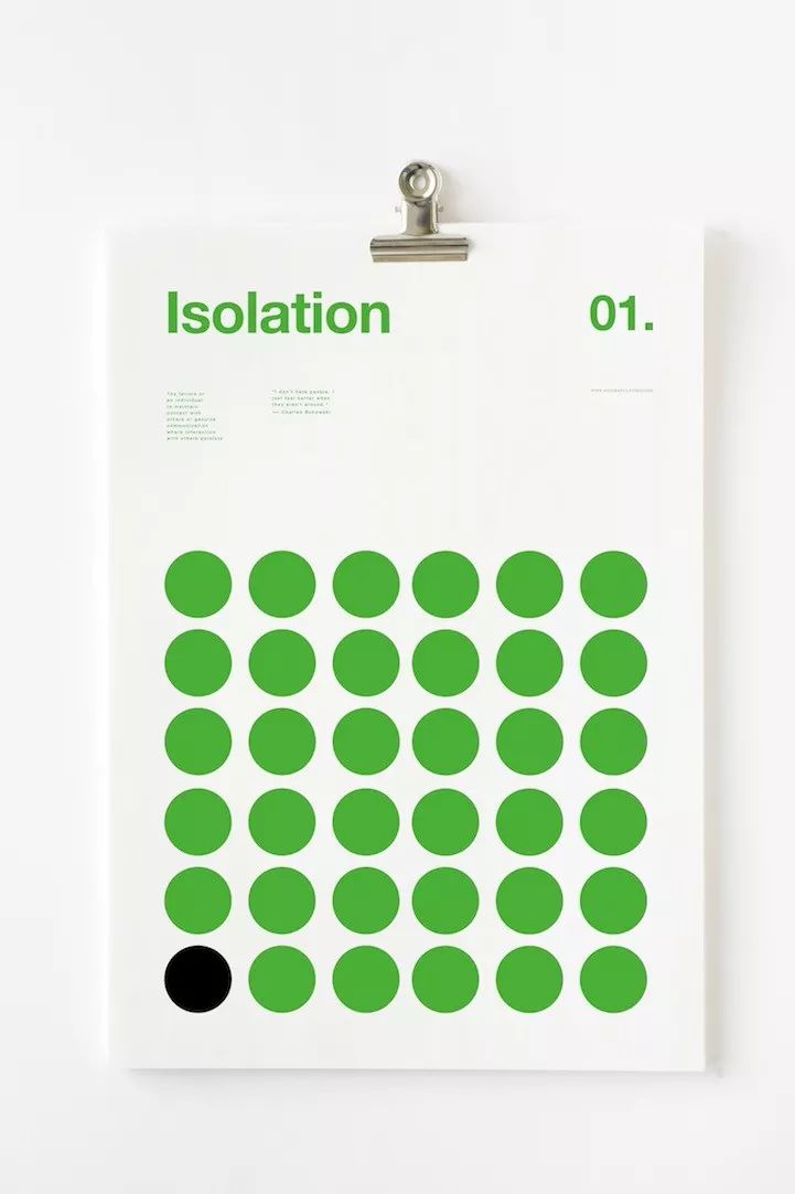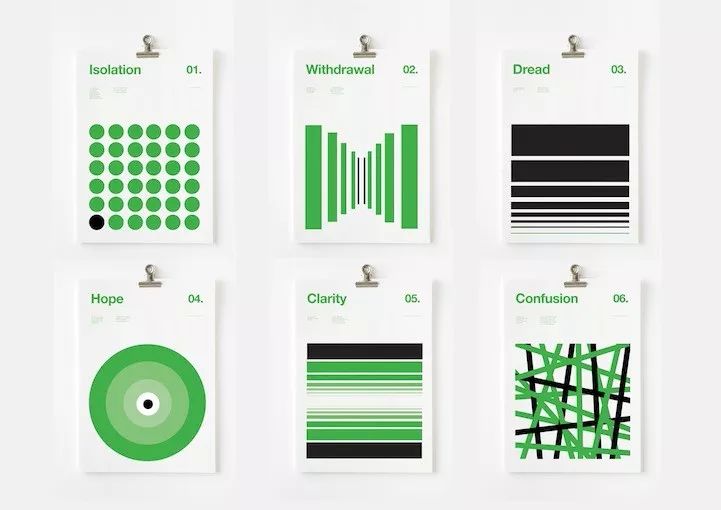 为了让更多的人了解抑郁症患者,帮助他们走出封闭的世界。设计师Nick Barclay用简单的几何形状和纯色设计,抽象的向我们描绘了抑郁症患者的个体症状。在这6副海报中,分别用线条、圆圈、圆点和线条的组合来处理孤立、退缩、恐惧、希望、清晰和混乱的抽象概念。