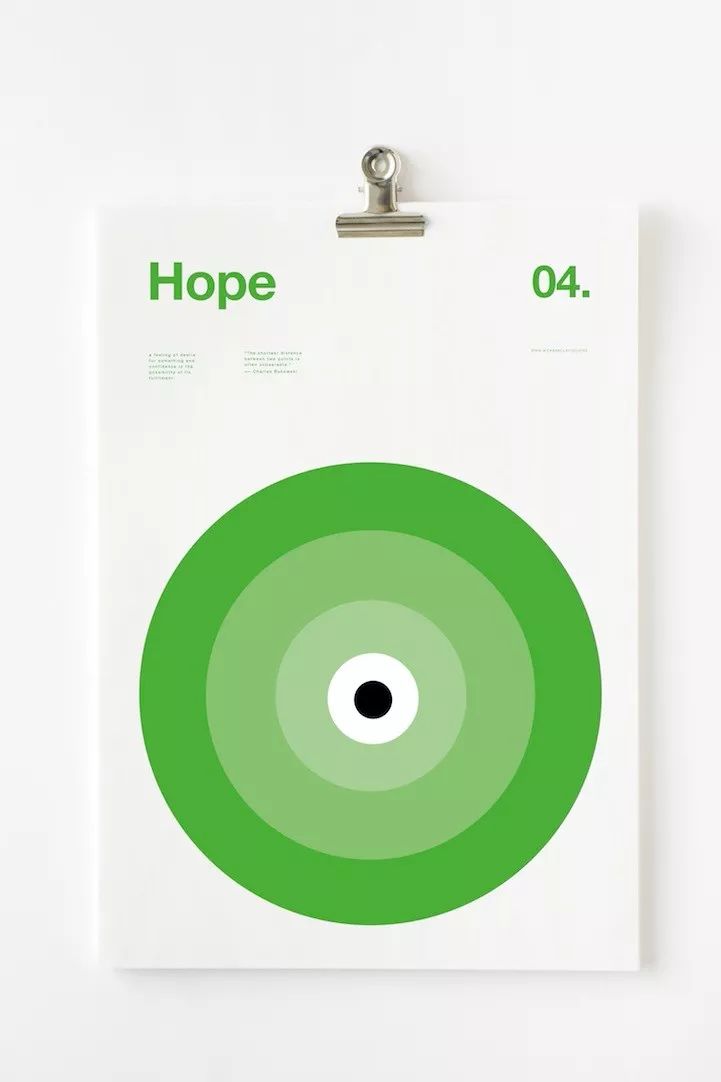 在其中一幅海报中,他通过绿色的镶嵌环来想象抑郁症患者缺乏希望,象征着对未来不同程度的乐观情绪。年轮正中央的黑点代表抑郁的人,他们感到与未来的幸福和成功切断了联系。