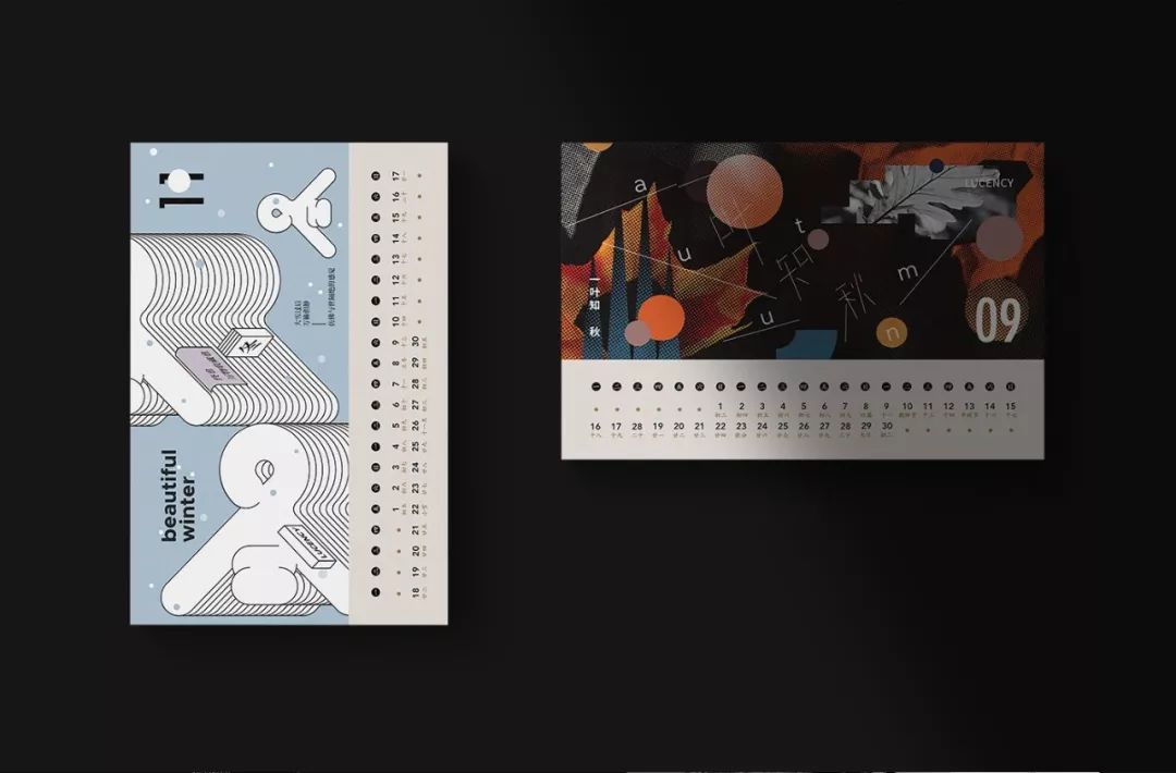这是为 LUCENCY 集合店设计的2019年年历,年历由八个企业业态、春夏秋冬四个季节组合。设计的过程中通过或具象或抽象的手法来围绕主题表现。