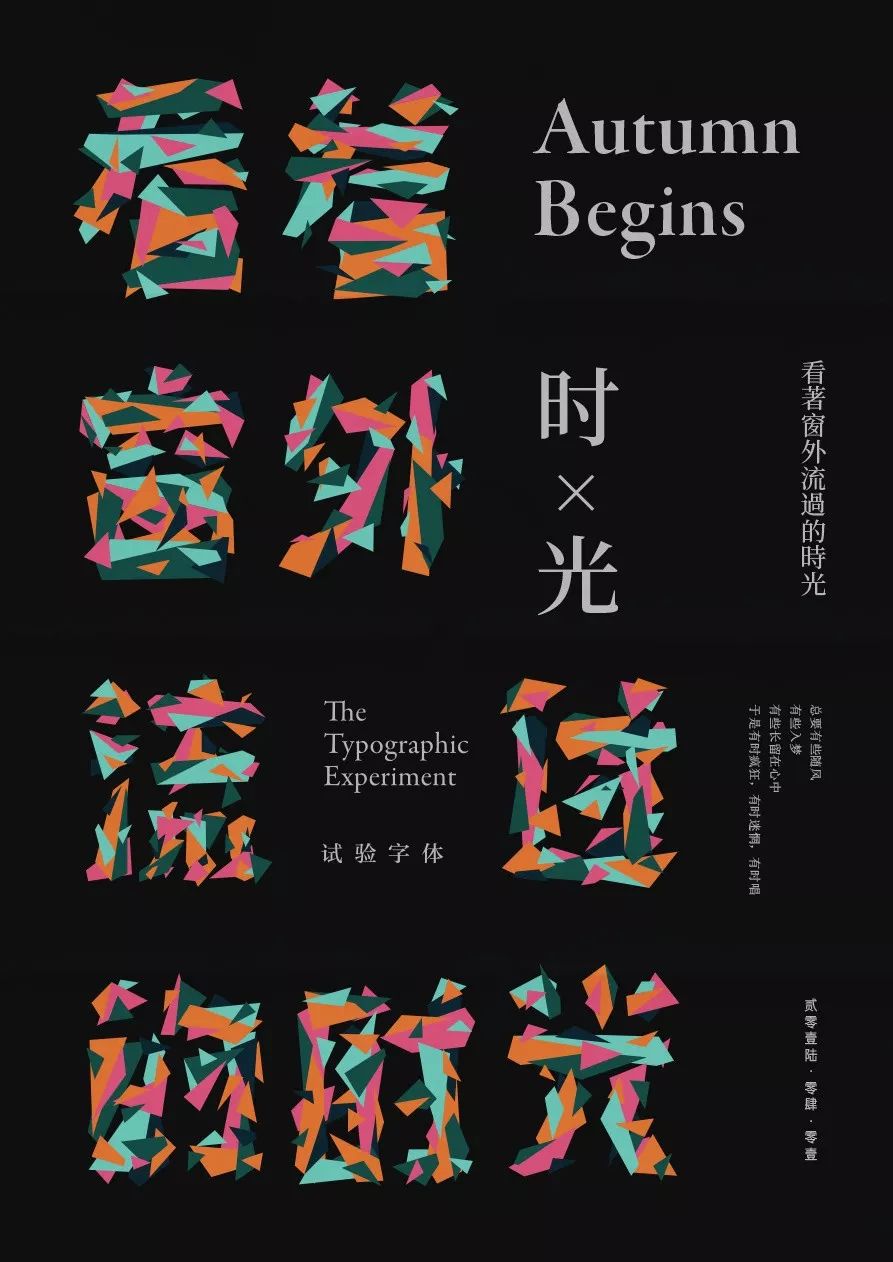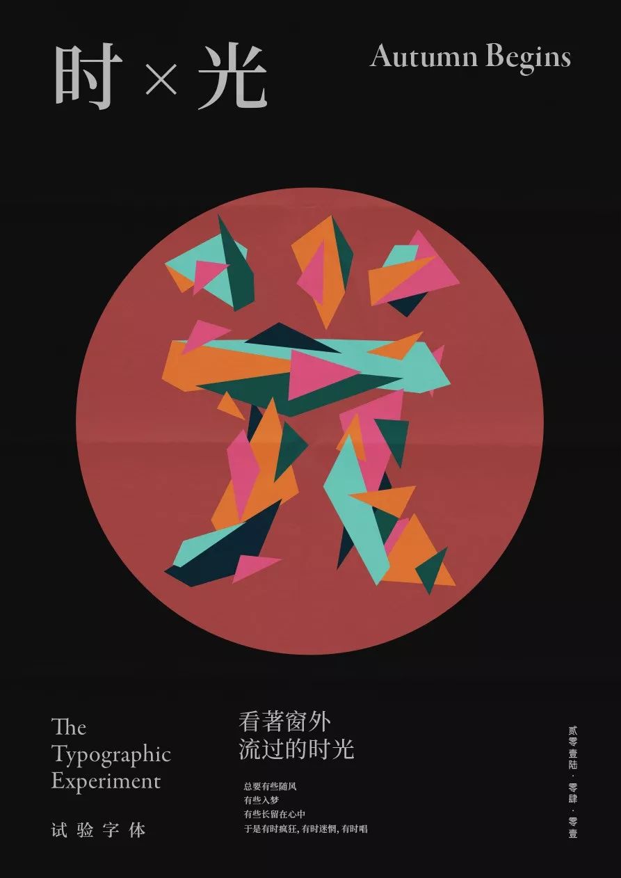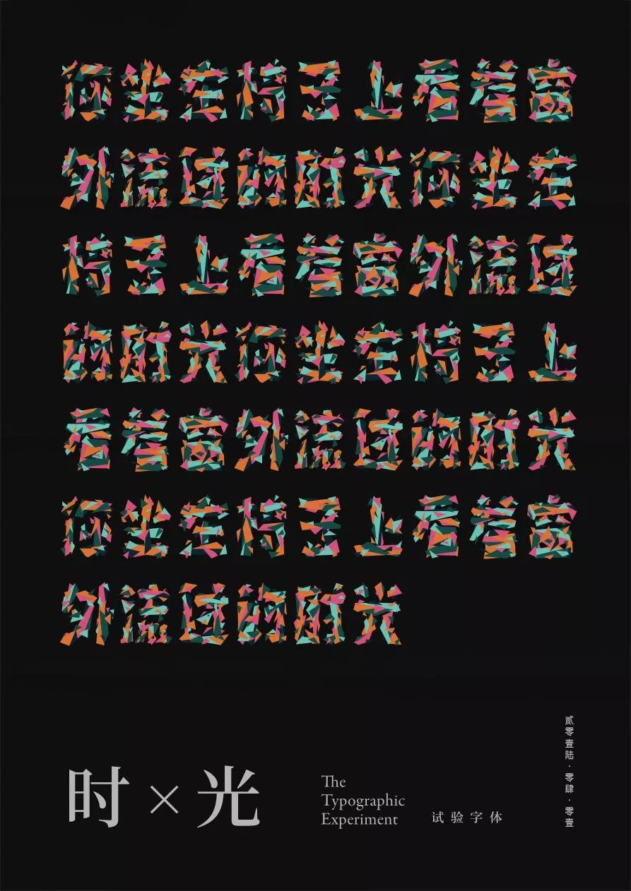 字体以源自于碎玻璃的菱形结构和光影为灵感,以菱形为载体,色彩为情感,尝试通过将字形结构轮廓化和多彩顔色的组合,赋予时光这一情感的印记,节奏感十足,富有张力,意在表现美好的回忆和青春。