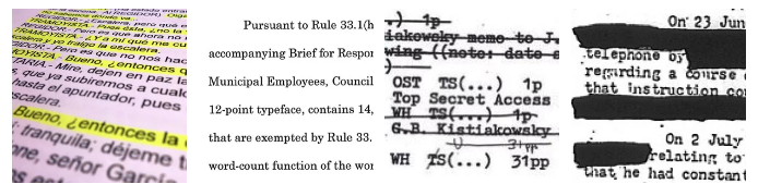 从粗体到斜体,从易读到难以辨认——就好像那些被反复复印的法律文件,文本逐渐模糊,甚至重要内容被涂抹、遮盖。