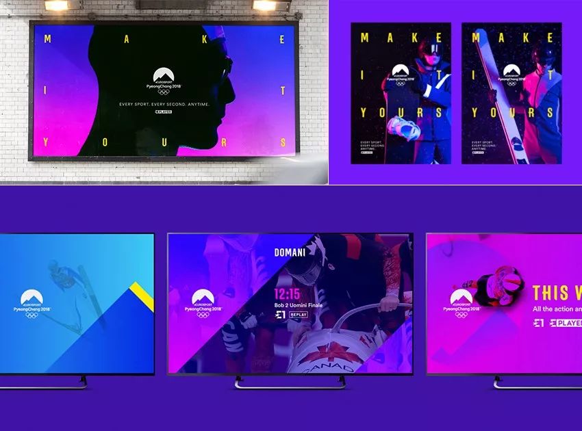 欧洲体育台2018年平昌冬奥会的转播也将强对比和渐变色运用于多数场景中,包括logo,图形和摄影。荧光图形和深⾊背景的对比,尤为深刻地凸显了冬季运动的感觉。