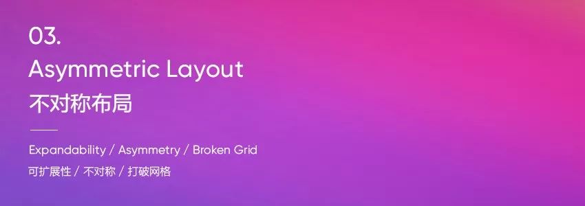 与过去基于固定网格系统的布局相比,最近越来越趋于使用仅显示图像一部分的非对称布局。虽然好像只显示整个图像的一部分,设计师却可以在大系统中无限延展每个图形。你可以认为平衡被打破了,设计师却可以更加自由地应用图形元素,呈现更强烈的视觉效果,还可以有很酷的图形组成。
