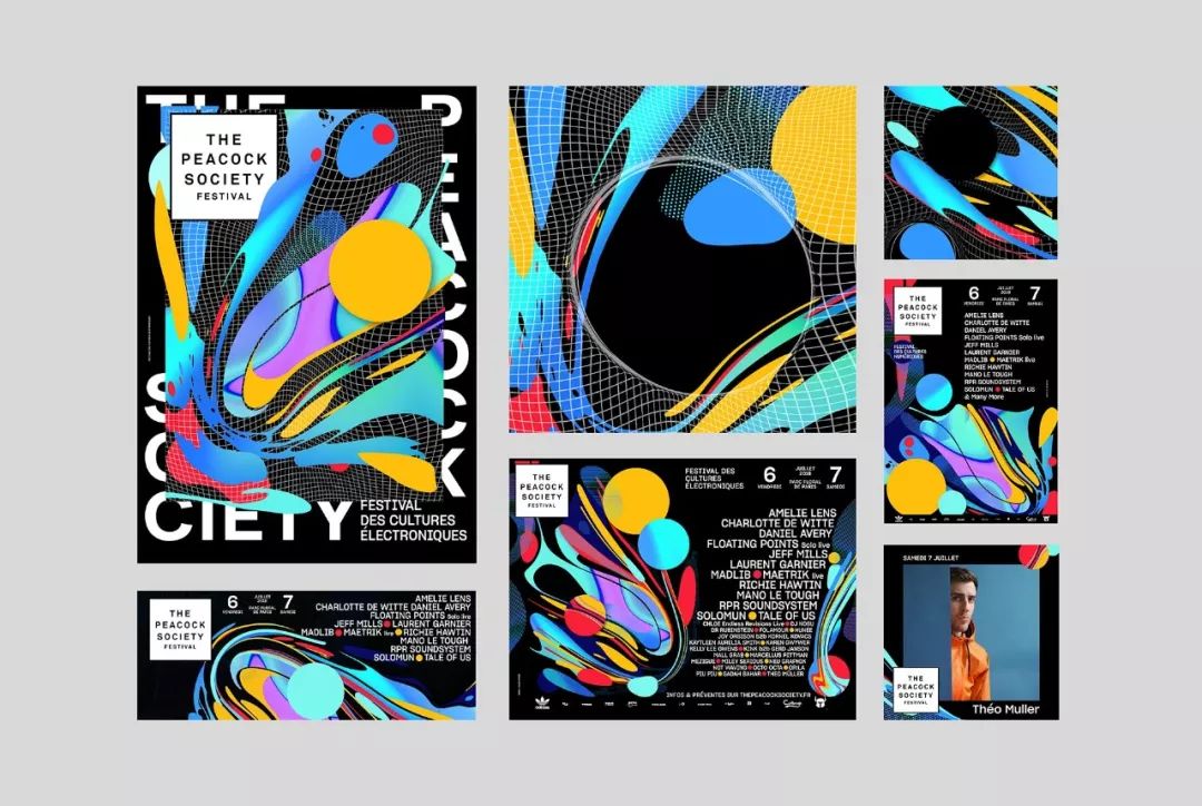 将明亮多彩的渐变色应用于有机形态,这些图像表达了巴黎电子音乐节的特征。