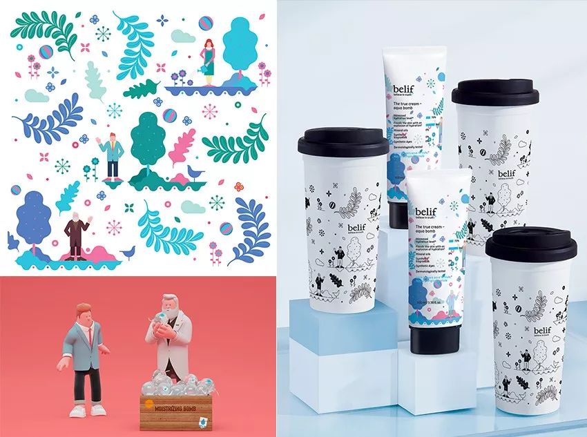 这是基于3D角色的2D图案设计示例,运用于包装设计和品牌视频。