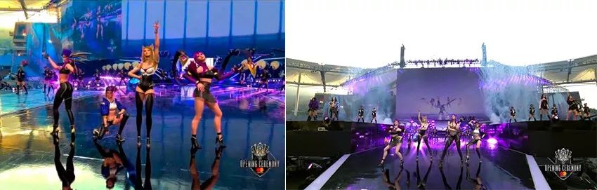 2018年英雄联盟的开幕舞台利用AR技术,使演唱POP / Stars的真人歌手和游戏里K / DA角色一起同台演出。这些被实时跟踪的角色,在实际舞台上带来了真实的表演效果。