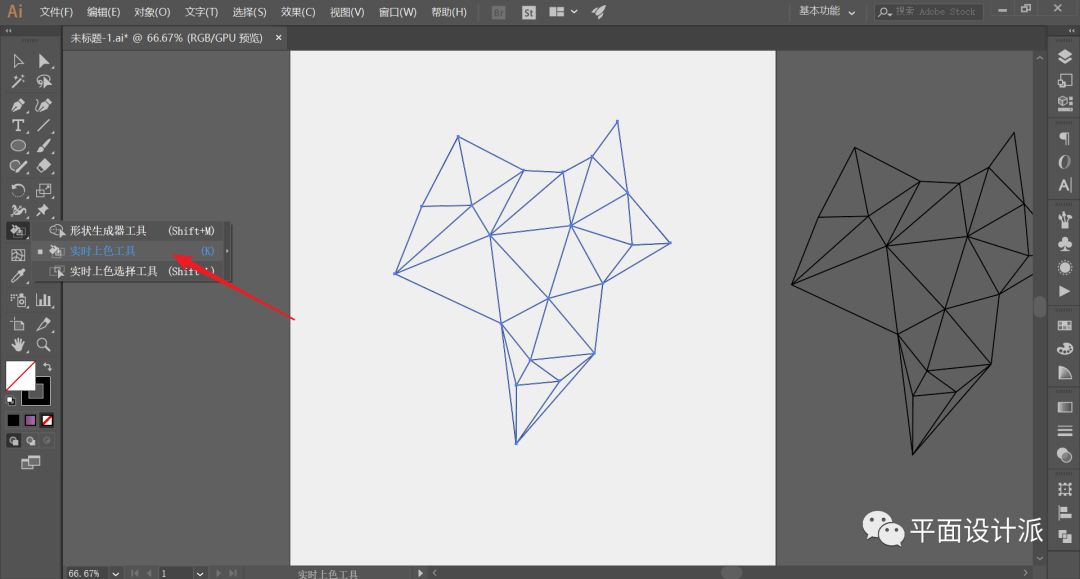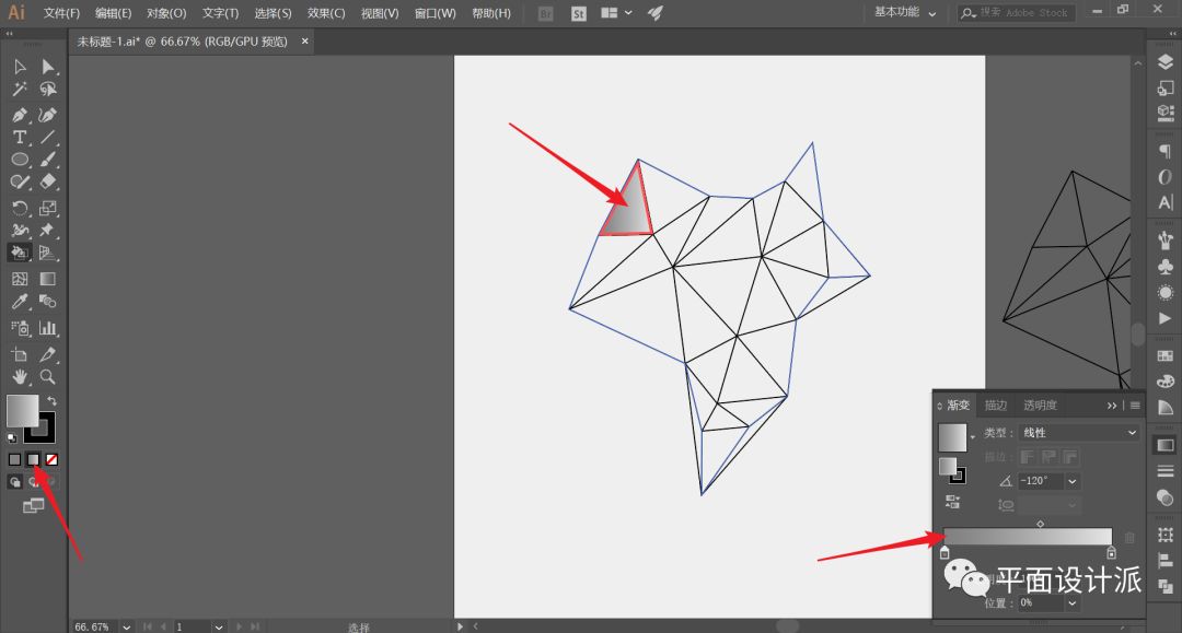 选择实时上色工具,将填充设置为如图渐变,最后鼠标移动至封闭的三角形,进行颜色填充即可,至于渐变角度可在渐变面板中进行调整: