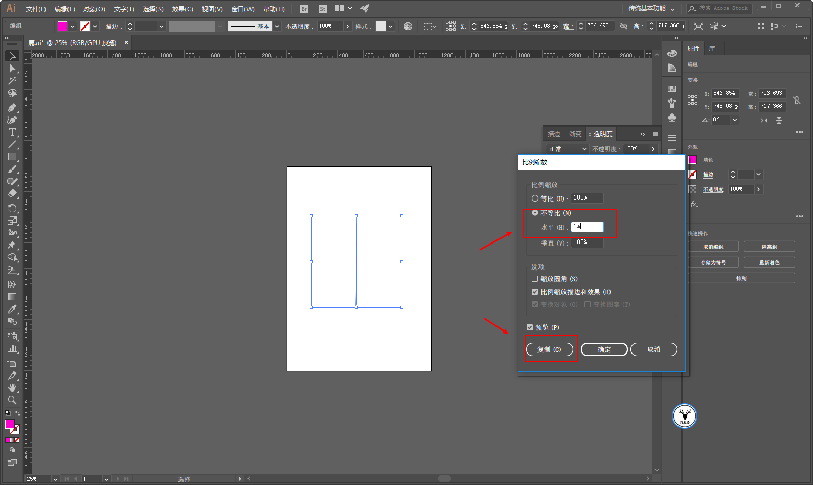 鼠标右键执行变换-缩放,选择不等比缩放,在水平位置上进行缩放,至于缩放多少大家看着感觉来就好,然后点击复制: