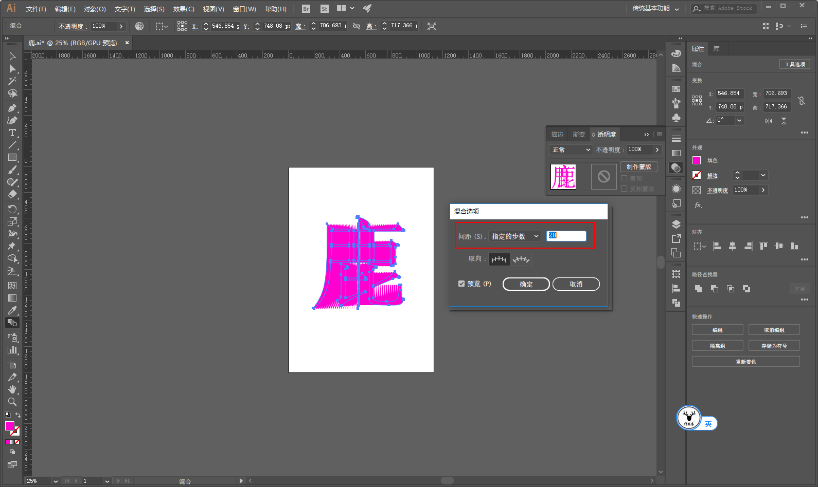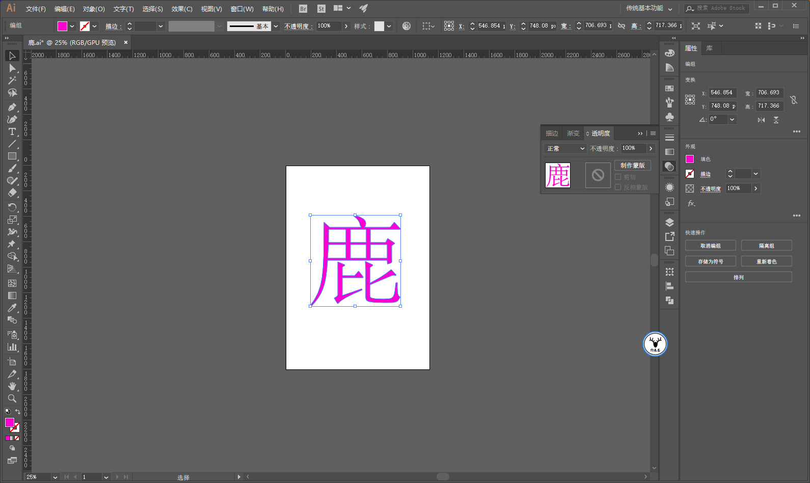 首先打开Ai,输入文字,这里顺带一提,因为涉及到对称以及缩放,这种效果不太适合左右结构的汉字,我这里以鹿字为例: