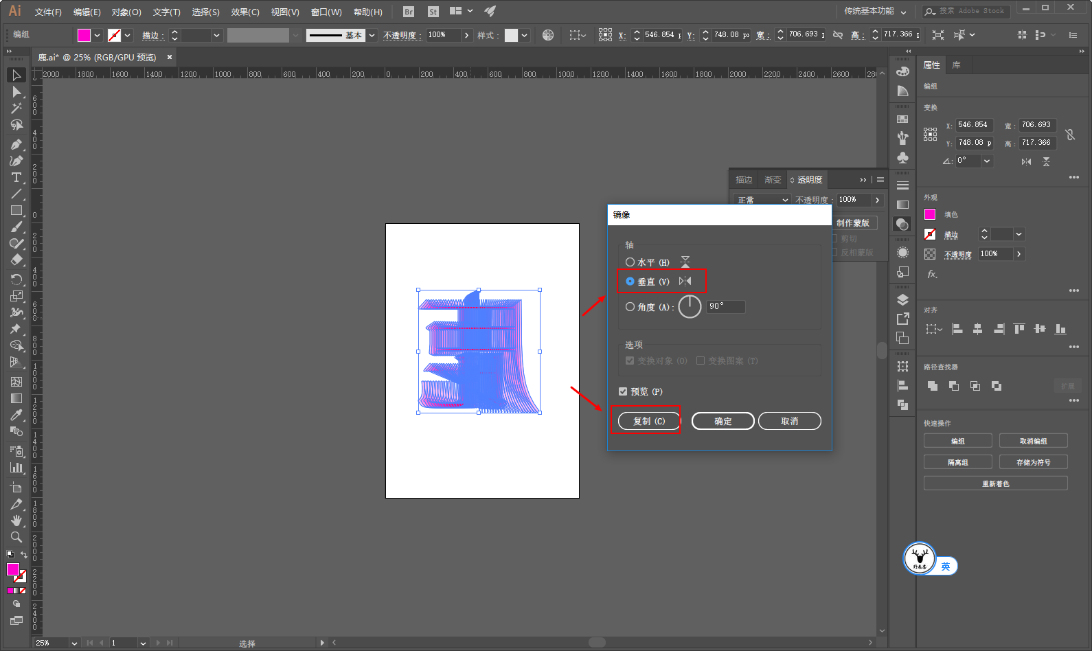 再次选中对象重新编组,然后鼠标右键执行变换-对称,让对象在垂直方向进行对称,点击复制: