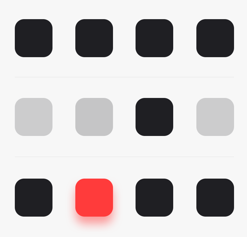 很明显第一排的形状之间是完全相同的,在视觉上给人的感觉就会很平,缺少变化;而下面两排在视觉上都营造了一个与周围存在存在差异化的视觉元素,使得整体在视觉上有了阅读的先后顺序,形成了简单的信息层级关系!