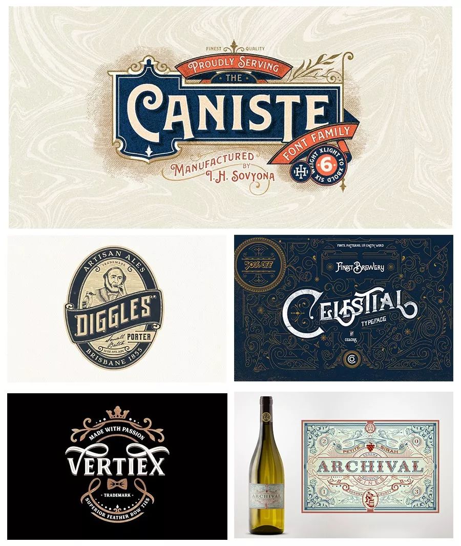 使用复古字体可以使徽标或包装设计看起来优雅和严肃。大胆与怀旧的错综复杂为作品本身增添不少经典的色彩。