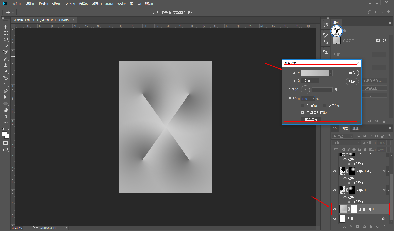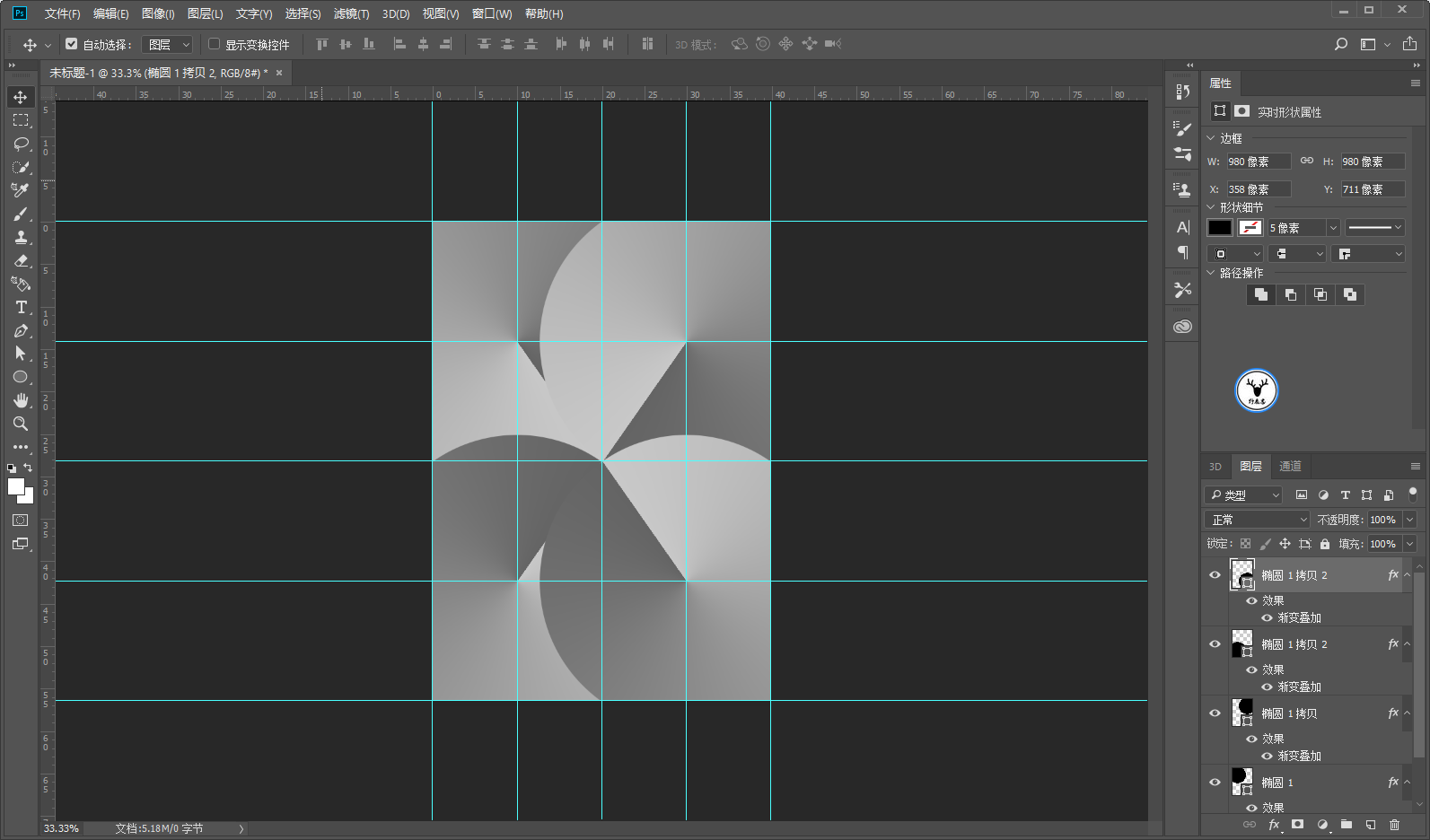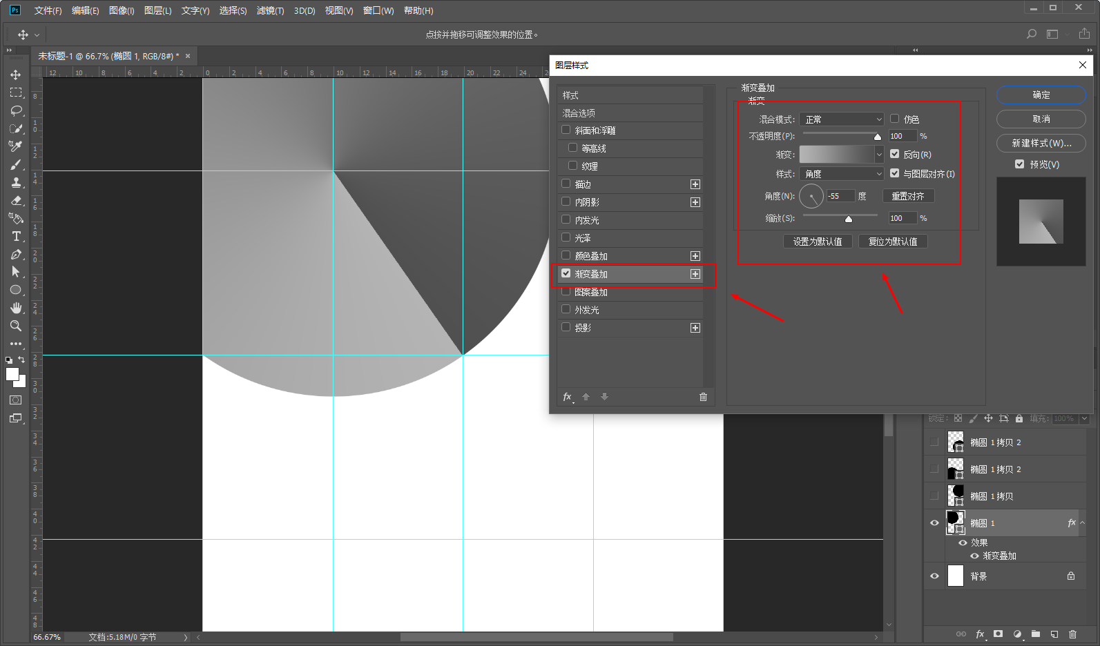 隐藏掉其余的三个圆,给其中一个圆添加图层样式-渐变叠加。
