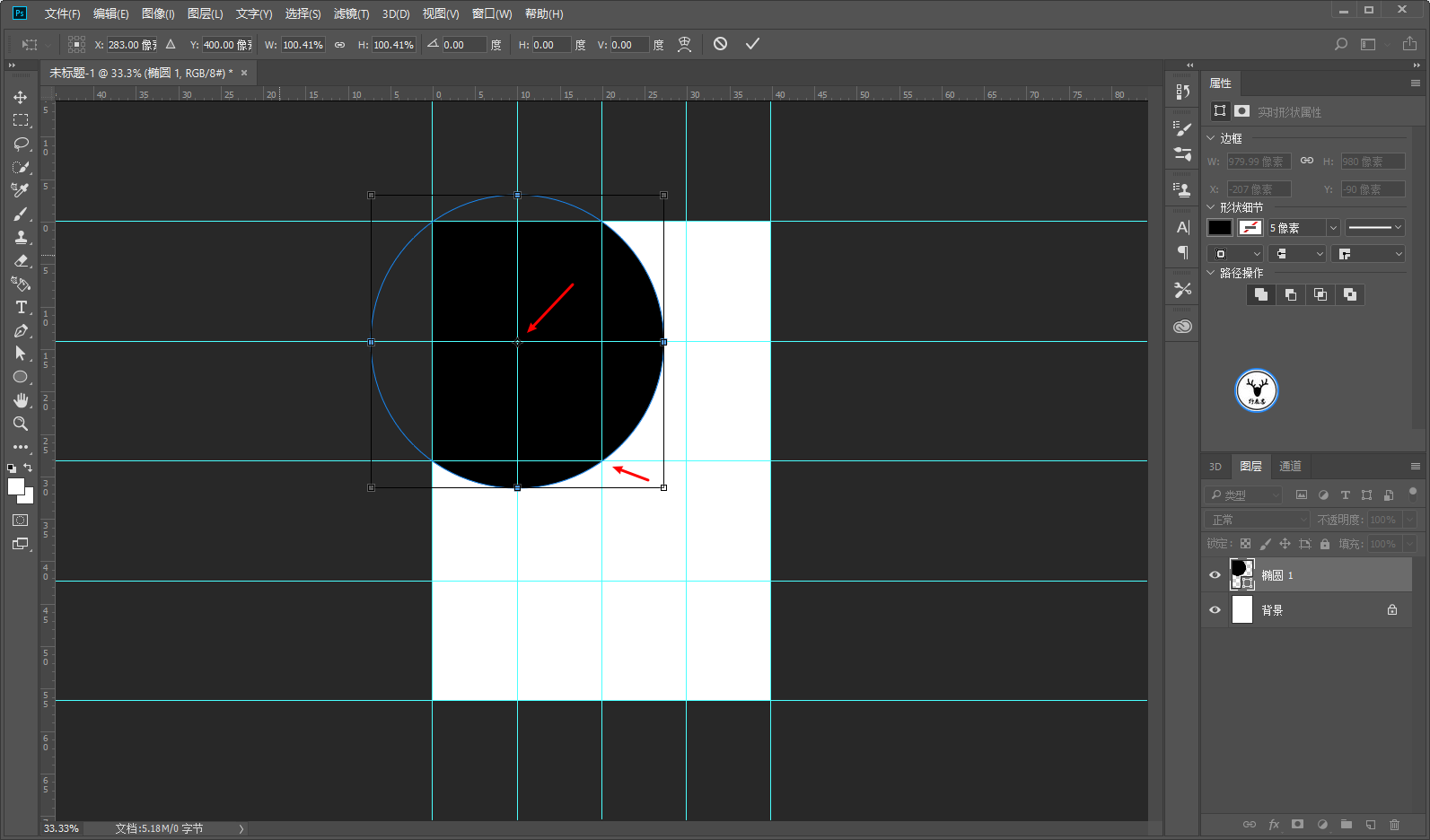 用椭圆工具,以每一份的中心点为圆心画一个正圆,让圆的边刚好经过画布的中心点: