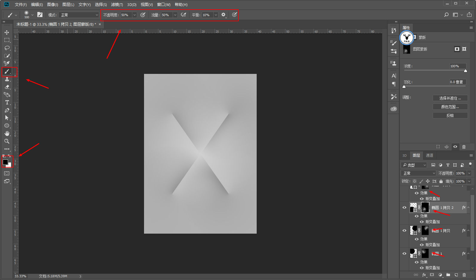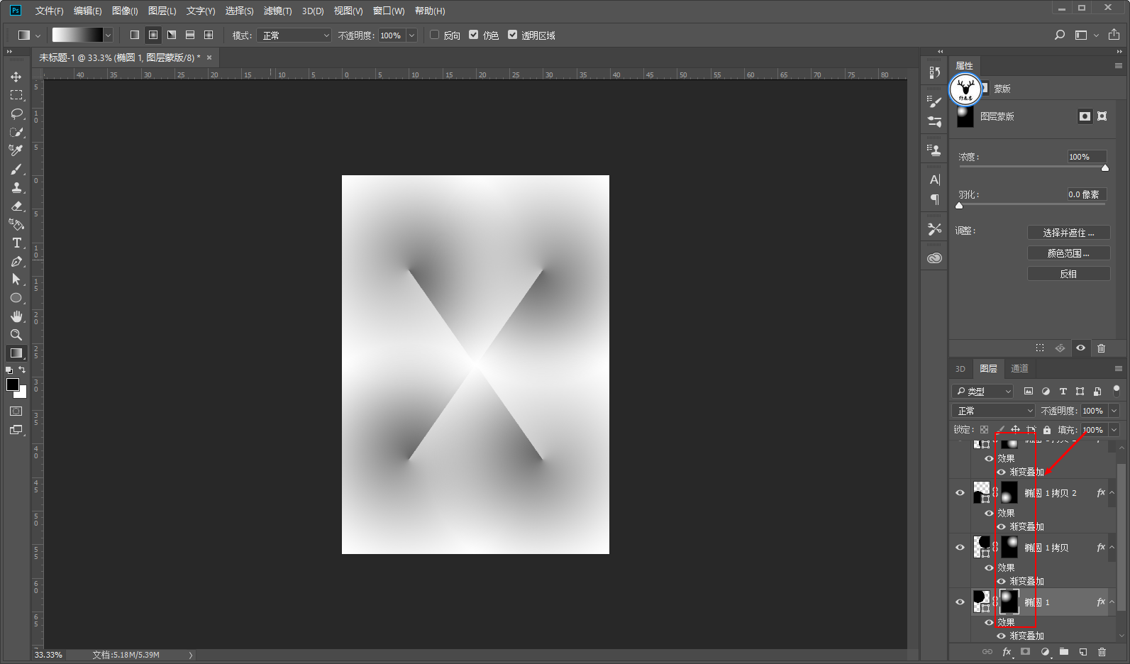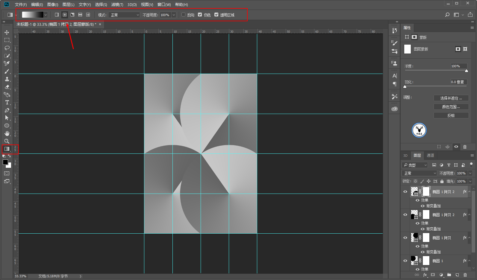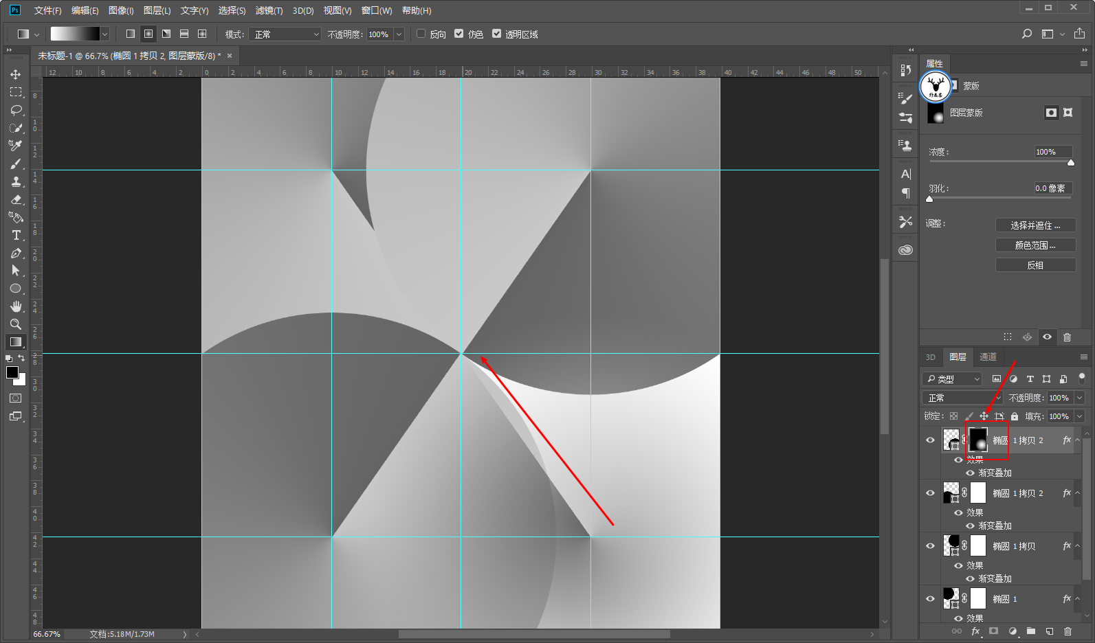 由于我们每一个图层都是圆,所以用径向渐变工具在圆的图层蒙版上从圆心到边缘拉一下渐变,这样很容易多余的部分就被搞掉了: