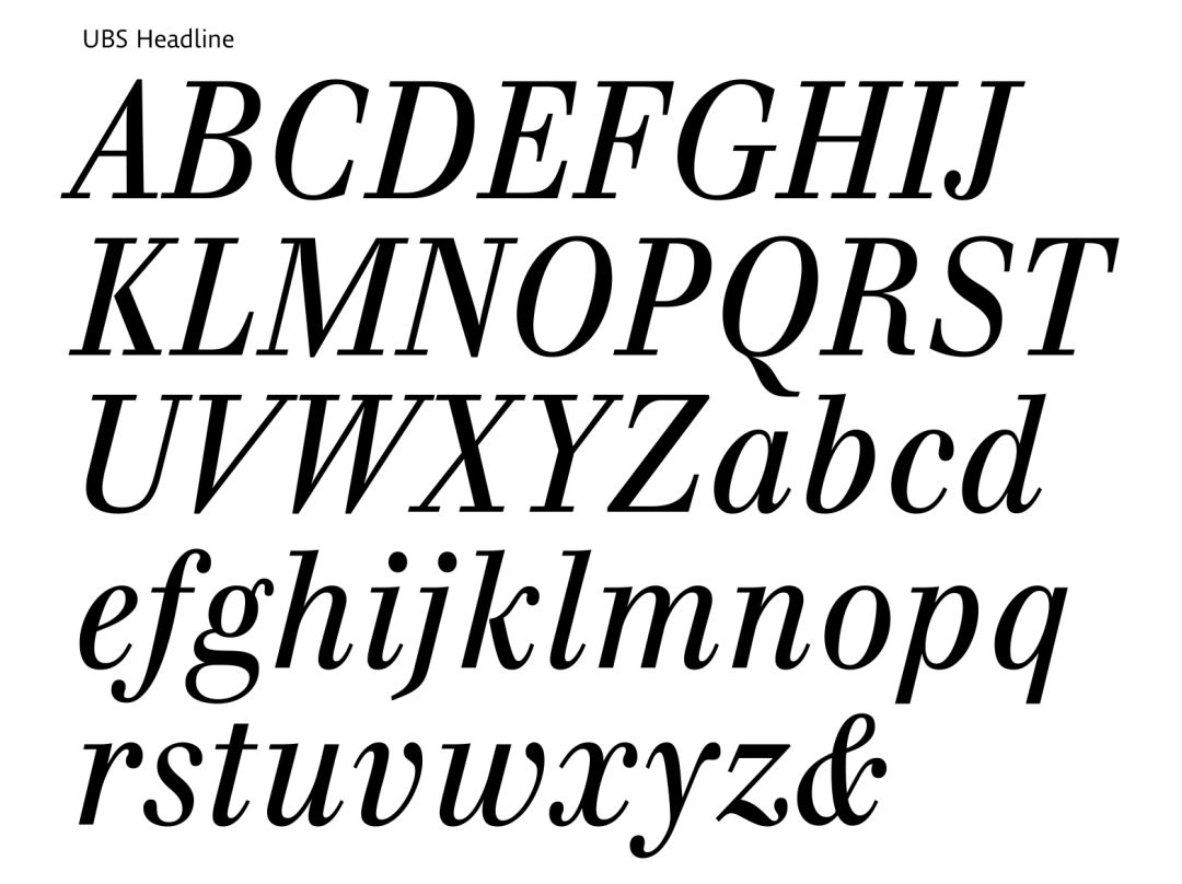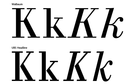 同样以倾斜字体(italic type)为基础的Walbaum字体,对于用于装饰的小写字母“k”等进行了调整。“z”这类字符倒是一定程度上保留了传统感,但并不会产生繁杂感吧。在保留高档和传统的一面的同时,UBS Headline突出现代感的目的也得到了确保。